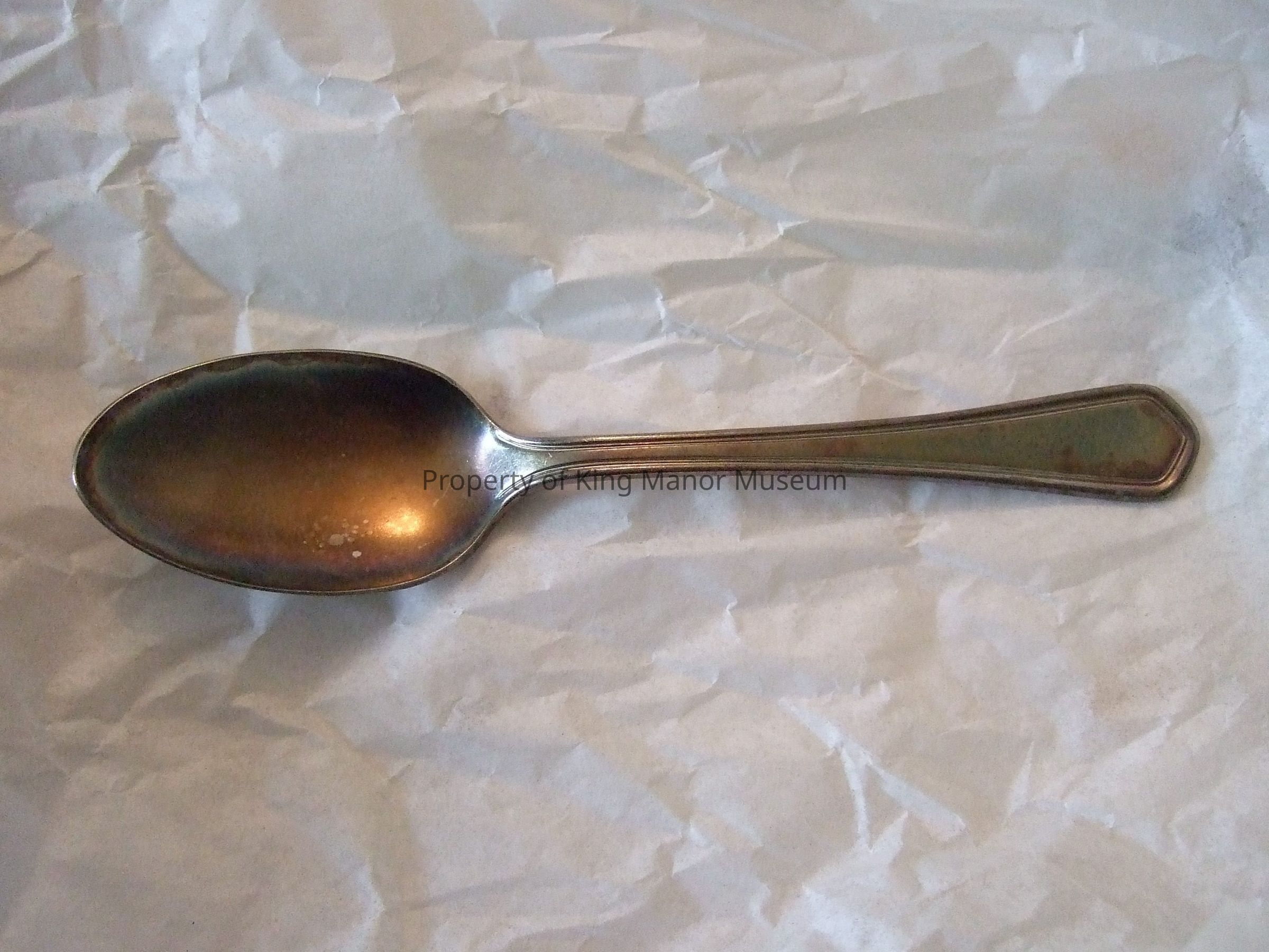 Silverplate spoon with pointed end handle. Stamped on back "Avon Plate A1/2"