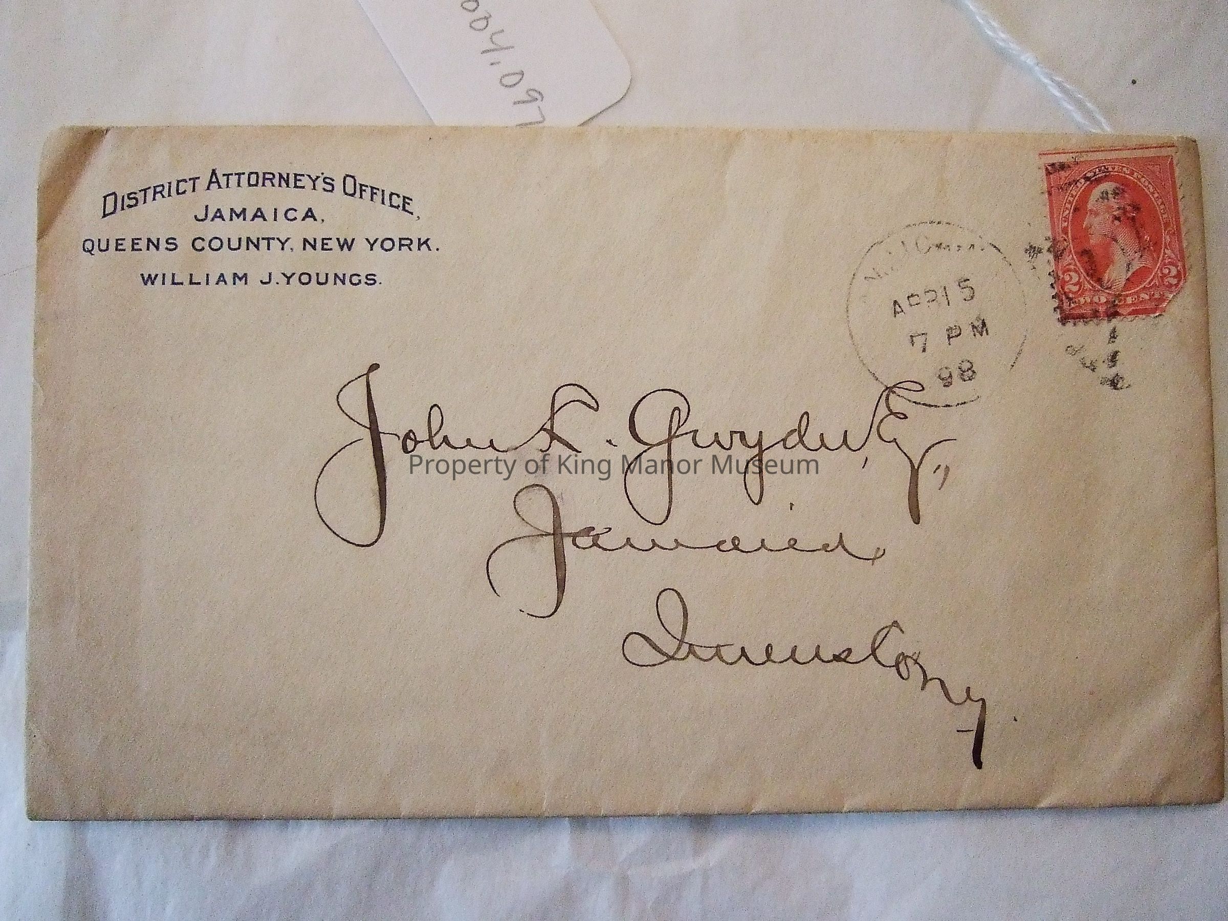 Dated October 4, 1907 handwritten in script to John L. Gwyder, Esq., 910 Willet St., Jamaica, N.Y. re: meeting tomorrow to to bay "in the machine" to see[? feed? hunt?] ducks. Envelope from the District Attorney's office of William J. Youngs.Collection