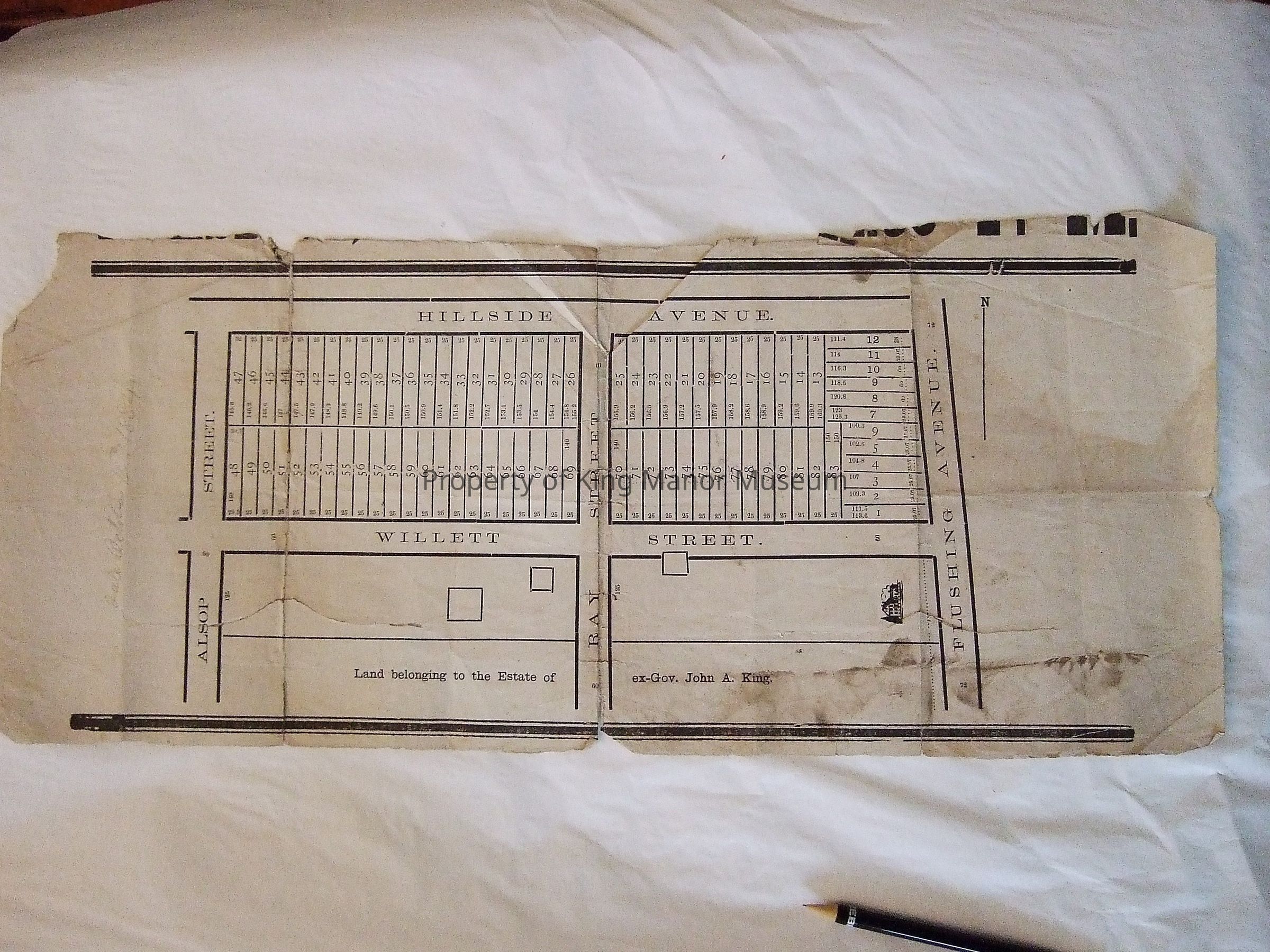 Printed map titled "Land Belonging to the Estate of ex-Gov. John A.King" depicting Alsop, Hillside Ave, Bay St., Willet St. and Flushing Ave. Handwritten in pencil "Date(?) Oct. 14th 1884/Sale"Collection