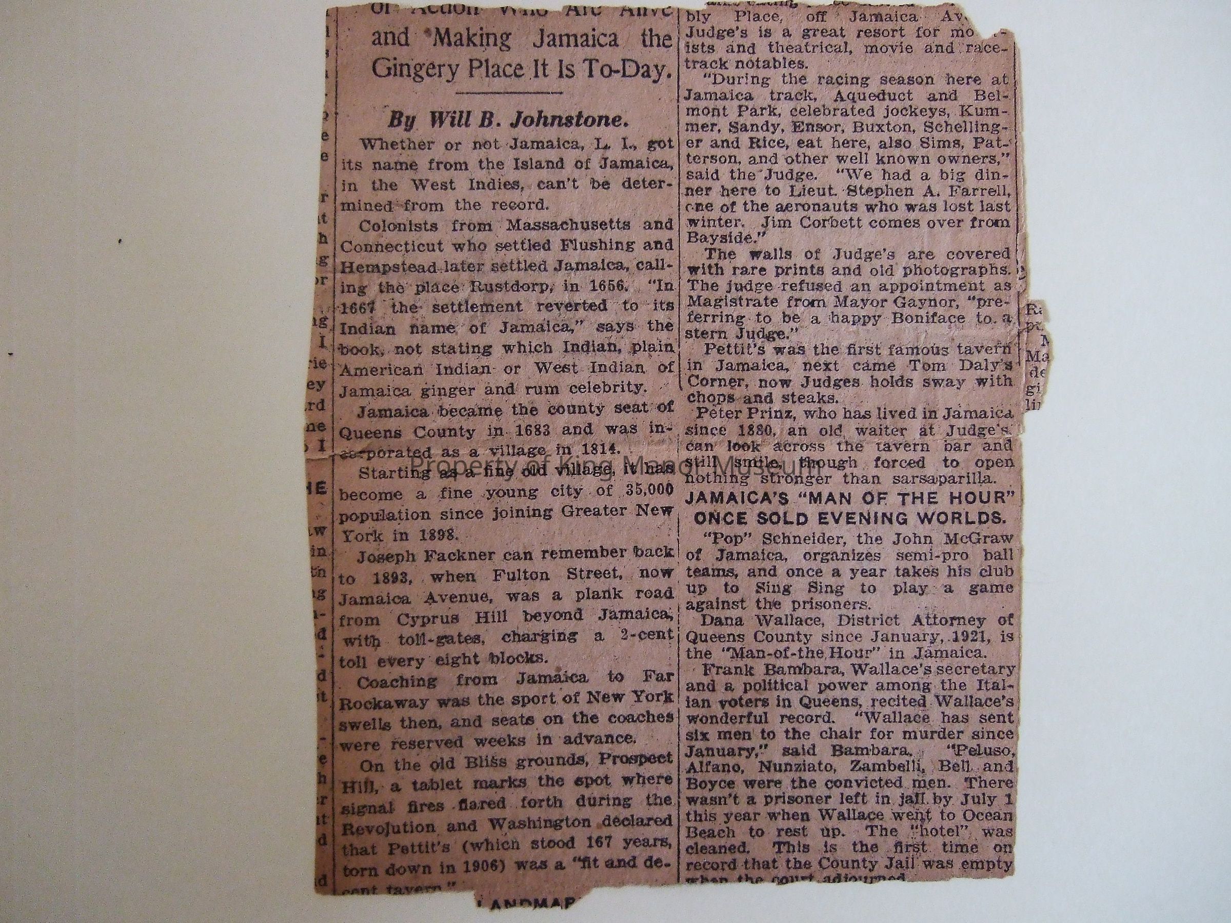Newspaper fragment re: history of Jamaica. c. 1920