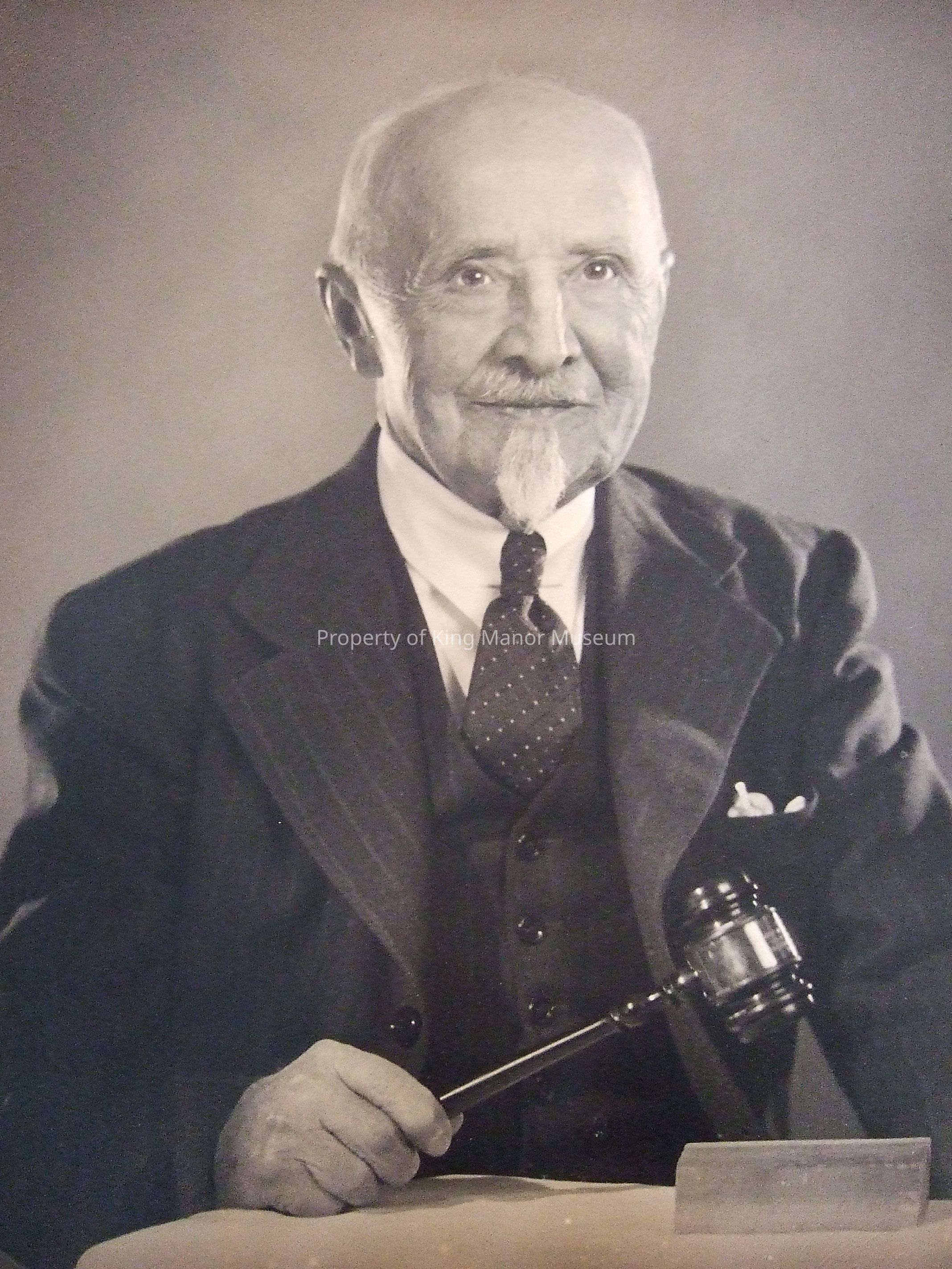 Black and white photograph portrait of older man with goatee, dressed in 3 piece suit and tie, holding a gavel.