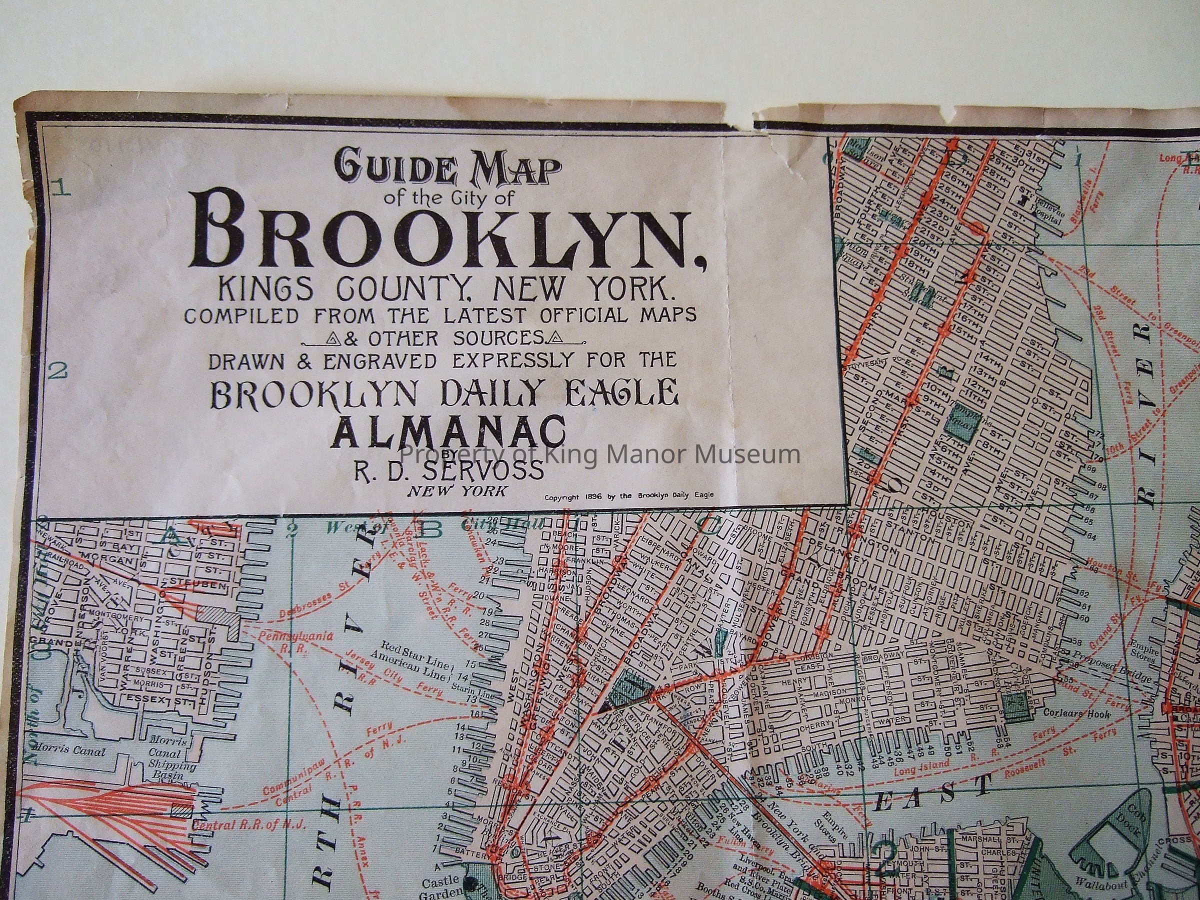 Guide Map of the City of Brooklyn printed in black, white, green, red and dark green colors on paper. Copyright 1896 Brooklyn Daily Eagle, "Drawn and Engraved expressly for the Brooklyn Daily Eagle Almanac."