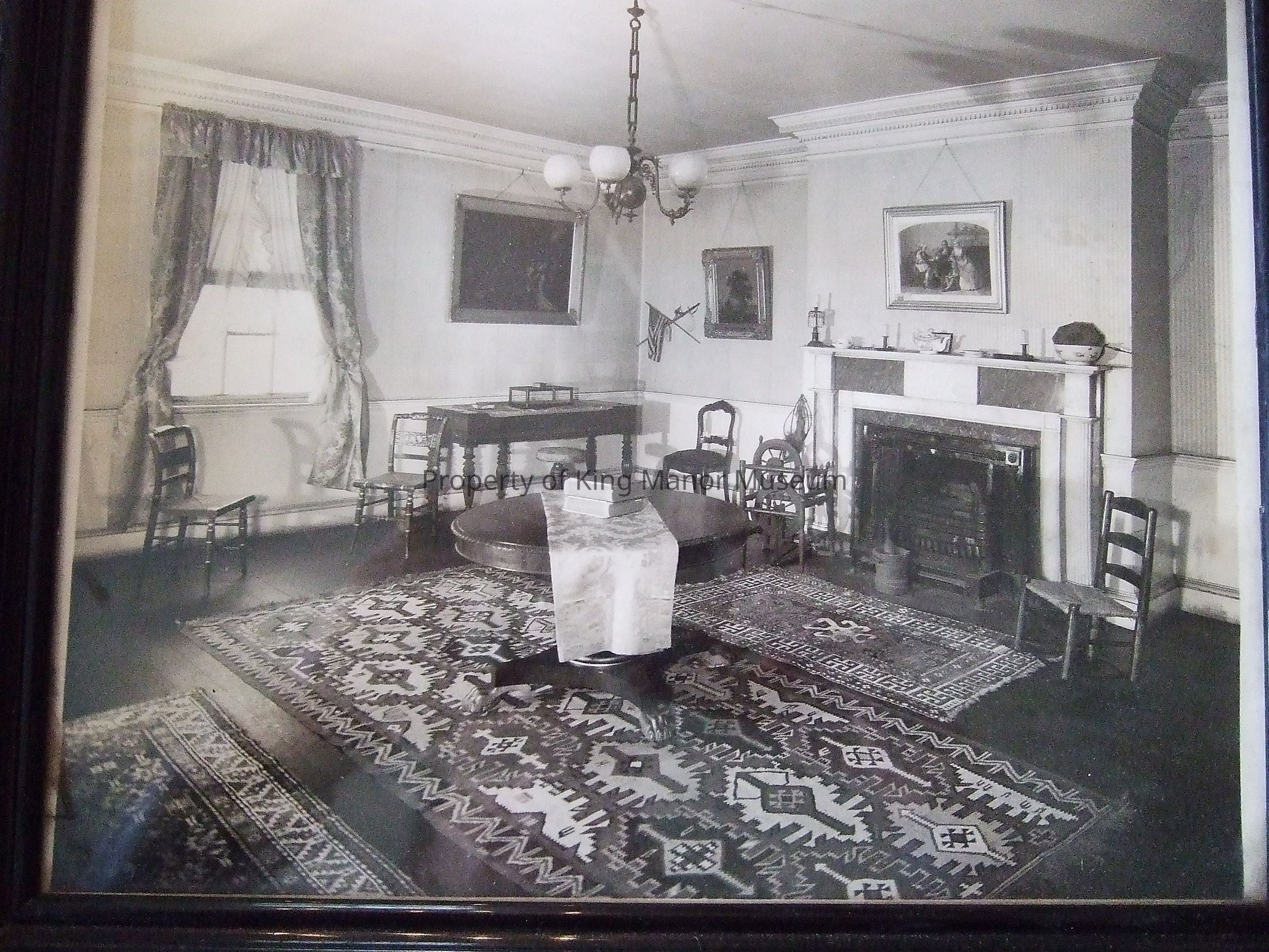 Framed, black and white photograph of front parlor, c. 1920s. Furnished with oriental carpets, center table, 2 fancy side chairs, 1 side chair, 1 rocking chair without arms. Black plastic frame.
