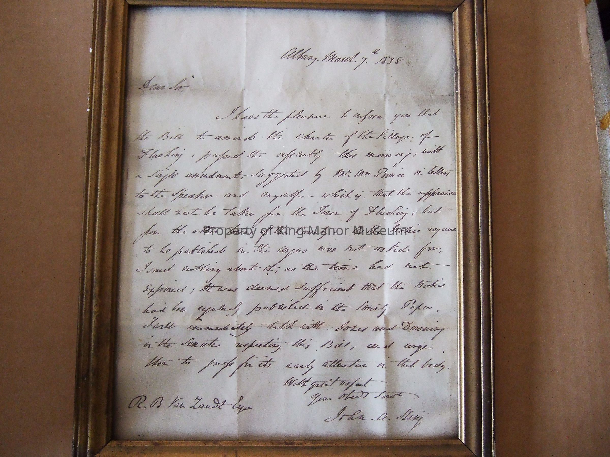 Framed letter dated "Albany, March 7th 1898" addressed to "Dear Sir/ R. B. Van Zandt. Esquire" from John A. King re passing of bill to charter the Village of Flushing. Gilded frame.