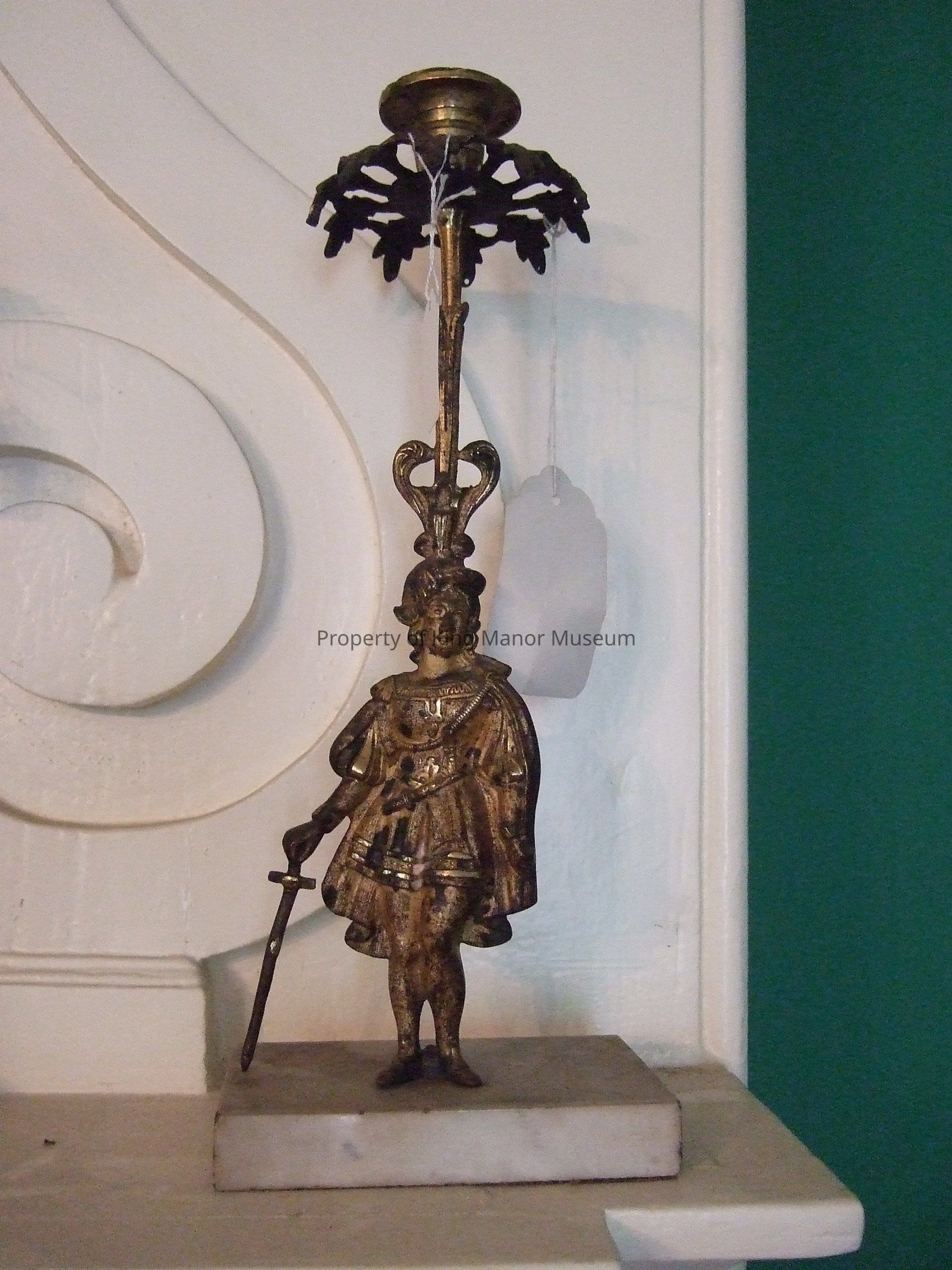 Three piece lighting set consisting of a candelabrum (a) and a pair of candlesticks (b,c). Molded brass in semi-relief of a figure of a soldier in Renaissance costume with a cap and hat with a feather, holding a sword in his left hand and wearing a dagger at his waist belt. Molded leaves frame the figure and sprout up to support 3 candleholders in (a) and single holders in (b) & (c). Bobeches composed of leaves with holes to hold crystal prisms. Set on marble base, secured by a screw.