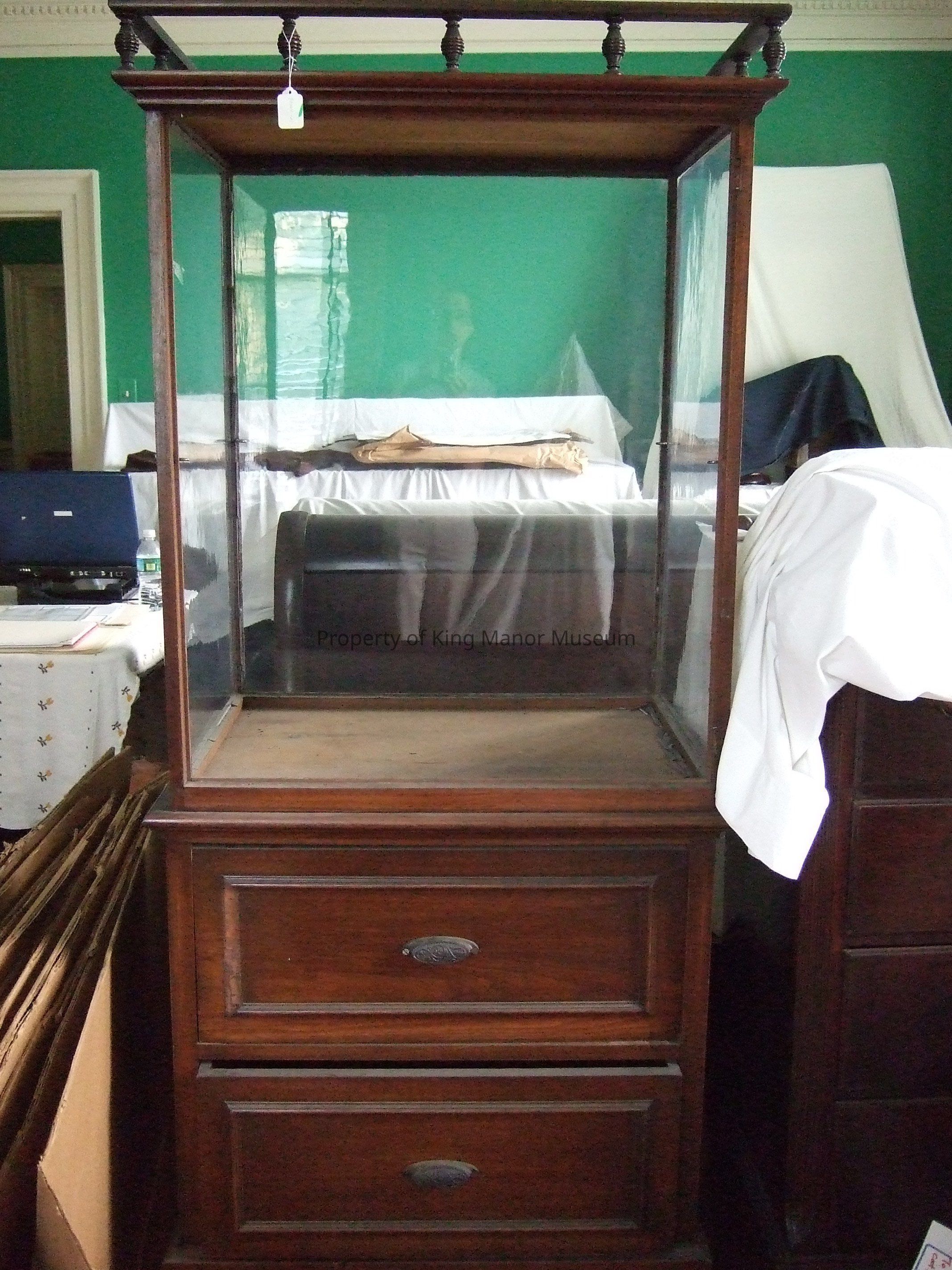 Wood (cherry?) display cabinet, in two pieces, glass case with decorative rail on top edge, two drawers on bottom with molded metal handles on drawers and on either side of base. Missing front door of upper case.