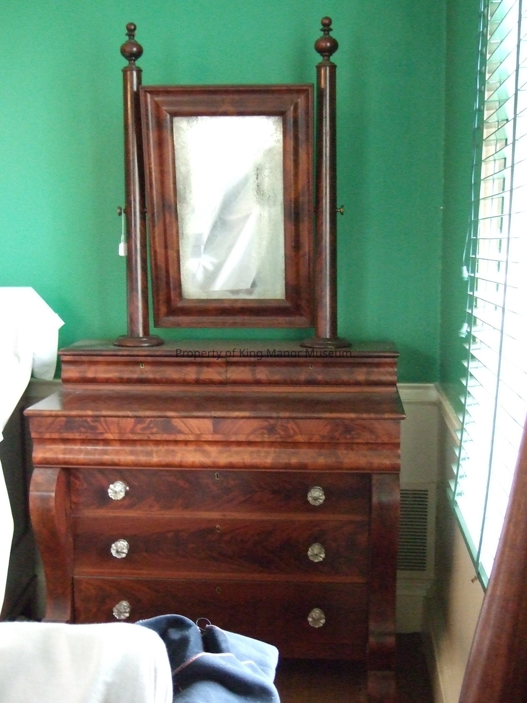 Rosewood or mahogany chest of drawers and mirror, with cabriole shaped ornament on sides, set on C-scroll feet and with 3 drawers on bottom with glass pulls (later replacements). One blind drawer overhangs the 3 lower drawers, mirror on stand features 2 blind drawers with keyholes. Mirror supported with pair of round columns with ball finials.Collection
