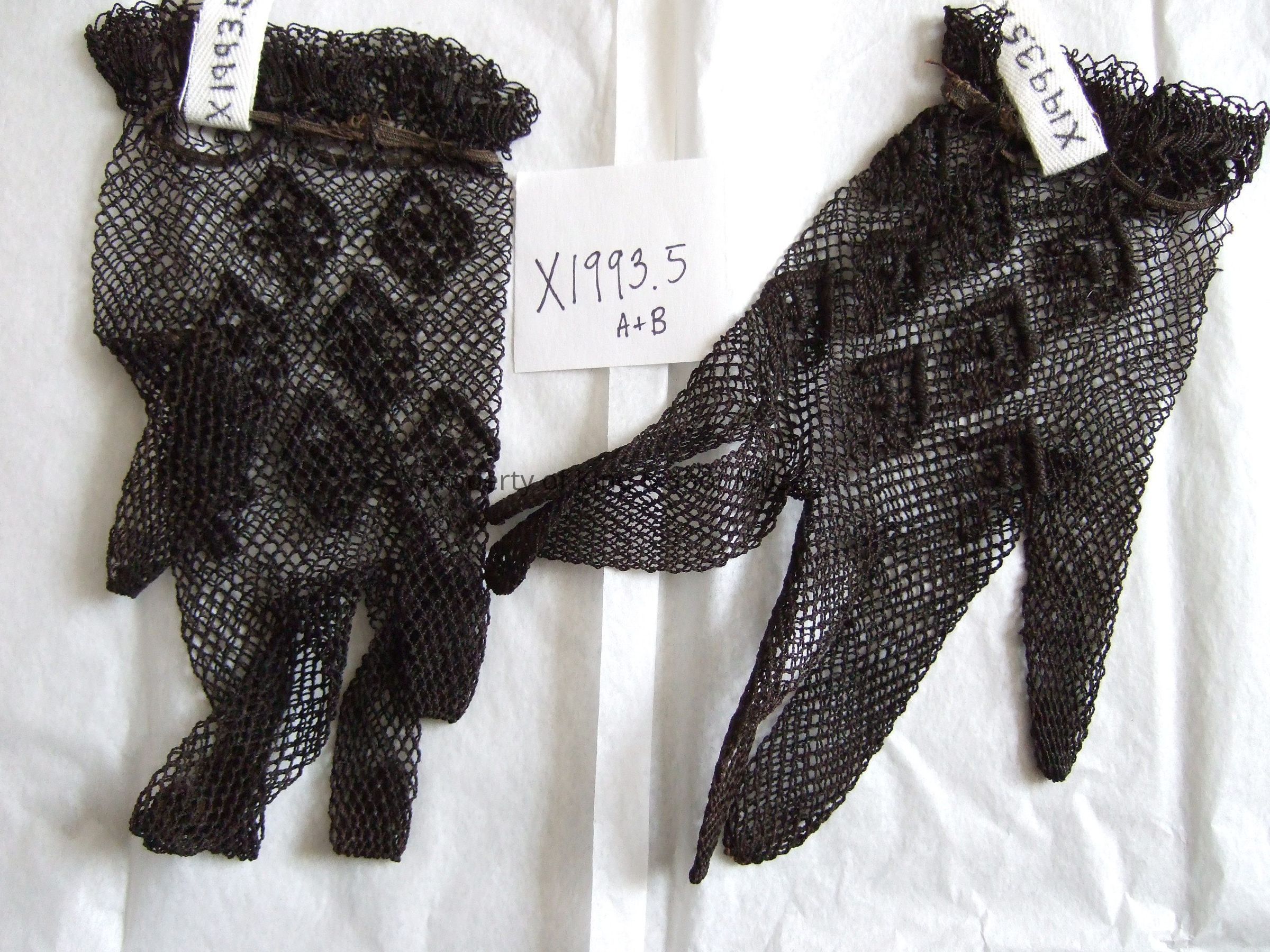 A pair of black fishnet ladies gloves with knit diamond pattern on back of hand and brown cord around wrists.