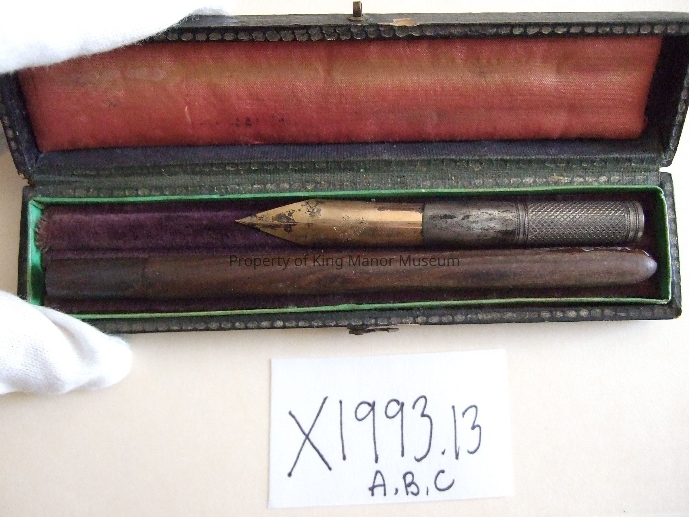 Ink pen in 2 pieces housed in box. Gold and steel nib and wood shaft. Nib fits over shaft. Wood and leather box with green cardboard and maroon velvet inset, with pink silk cushion on inside top cover of box. Brass clasp. Label on box top "Llewellen/DAR"Collection