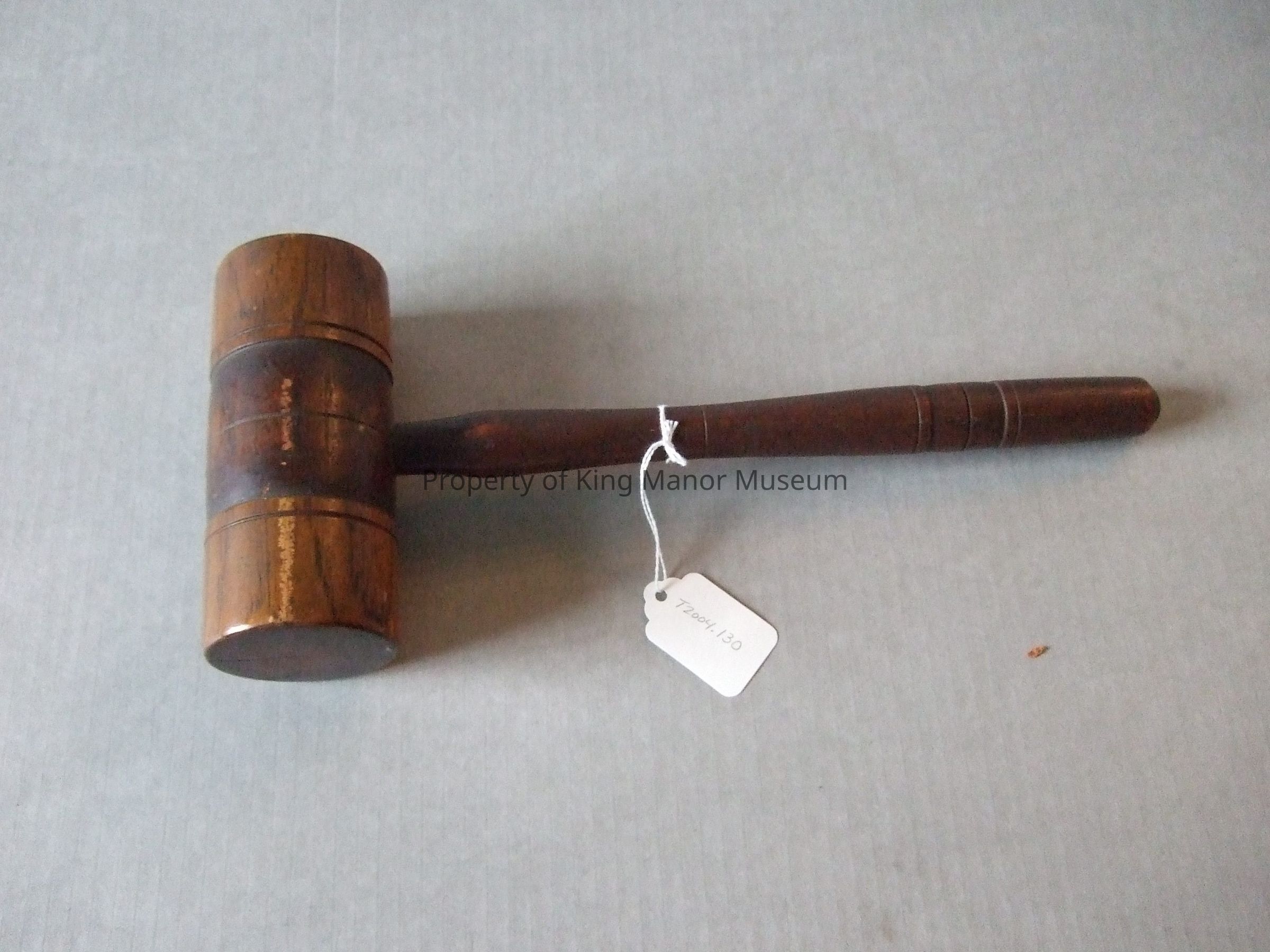 Light wood (oak or ash) mallet. Incised circular lines decorate ends of mallet head and handle