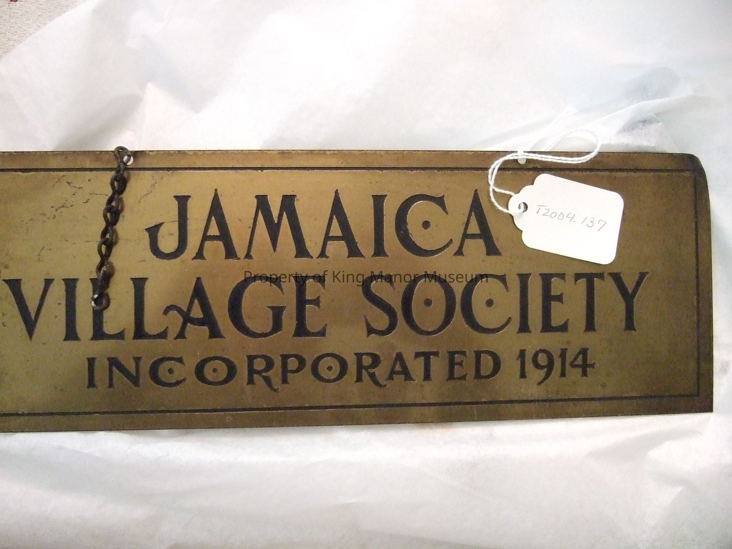 Brass plaque engraved "Jamaica/Village Society/ Incorporated 1914" with 2 hanging holes and incised border.