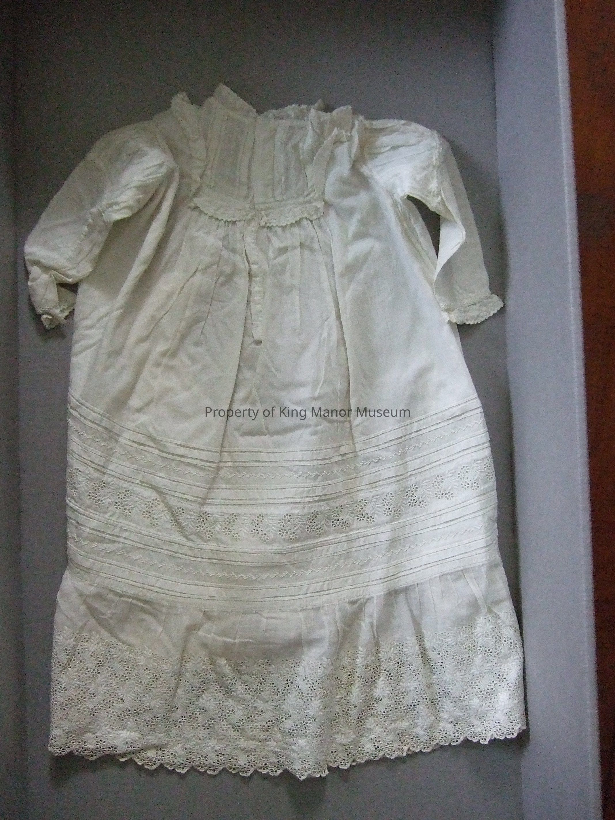 Cotton long sleeve, christening gown with band collar, 2 blind buttons, lace border along bottom , cutwork consisting of stems, leaves and 6-petal flowers.