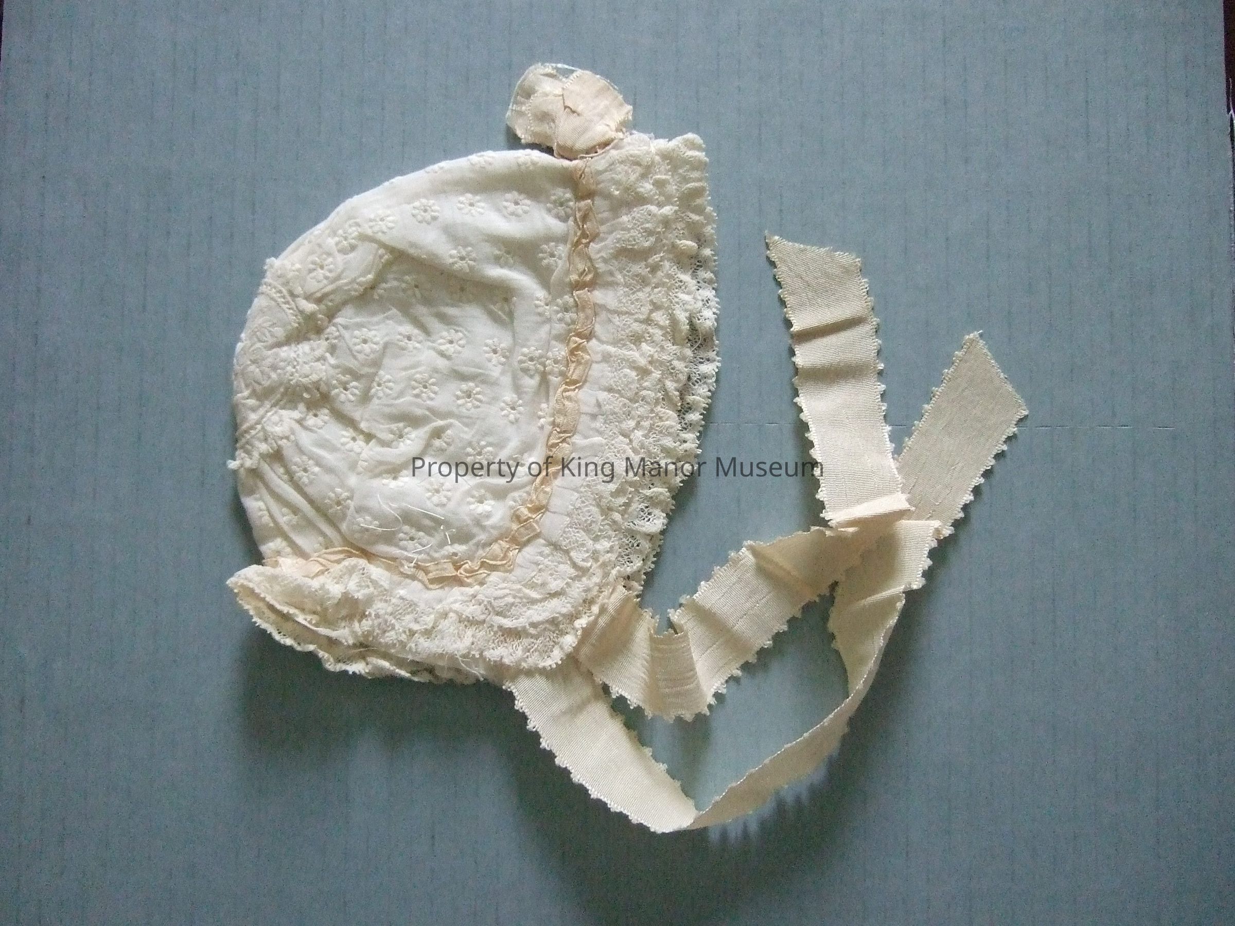 Cotton child's cap with satin ribbon, cutwork lace on body and border of tape lace. Handwritten in blue ink, "Cap worn by Mrs. John Hausman in 1890."Collection
