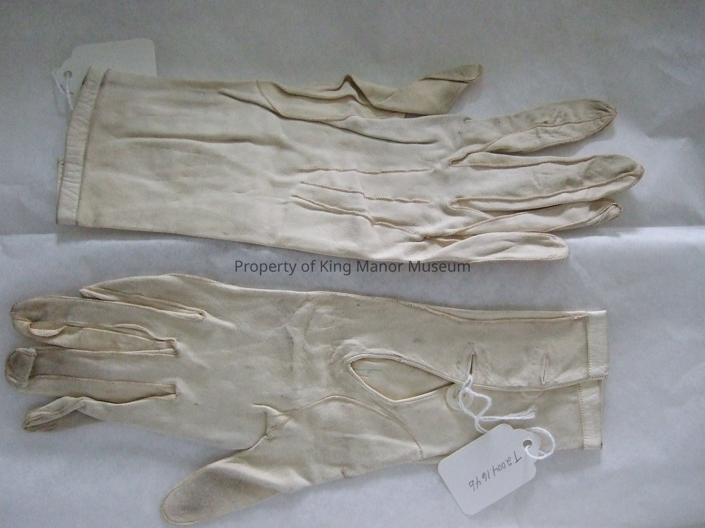 Pair of white leather gloves, size 6 1/2, with 2 buttons at wrist.