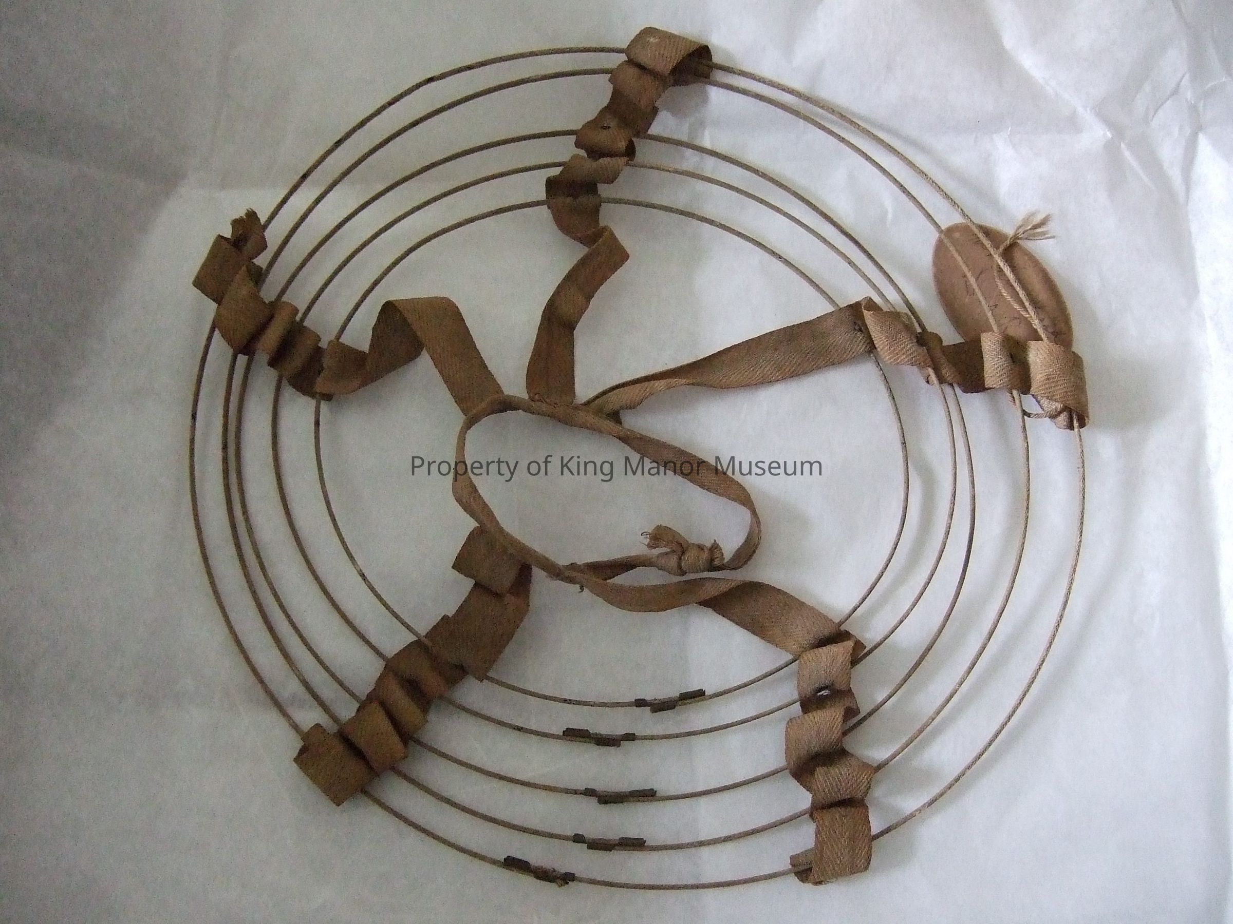 A doll's hoop skirt frame composed of 5 concentric wire hoops nailed to cotton twill tape. KMA sticker "Museum item 6IA5" Oval tag attached "Mrs. Blanchard/DAR"