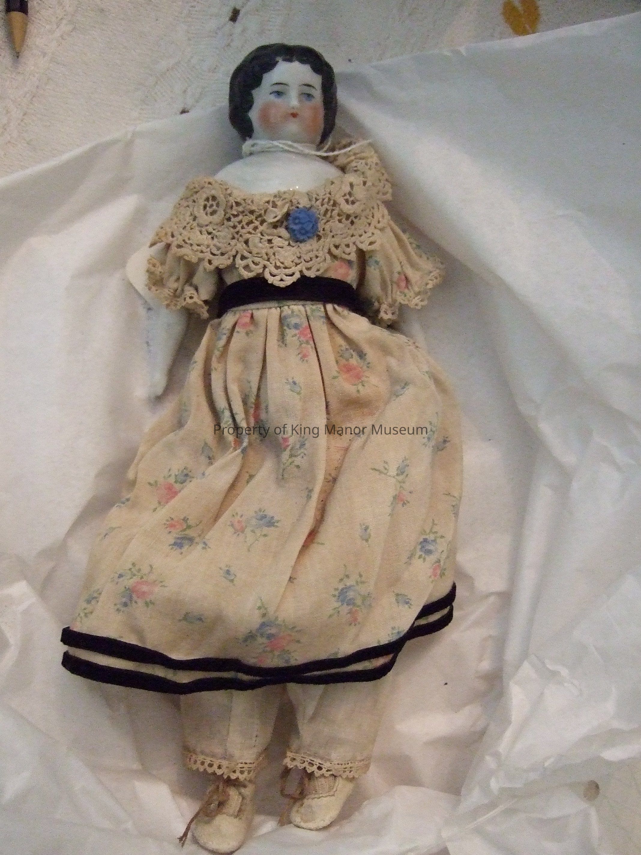 Doll with cotton body, white porcelain head, chest and arms; head is painted and glazed with black hair, blue eyes and pink cheeks and hear shaped mouth. Dressed in floral print cotton dress with 3/4 sleeves trimmed with lace, lace collar, and black velvet ribbon, around waist and sewn on at hem. Two back buttons on dress. Also wears slip, pantaloons trimmed at legs, white stockings and white leather shoes.