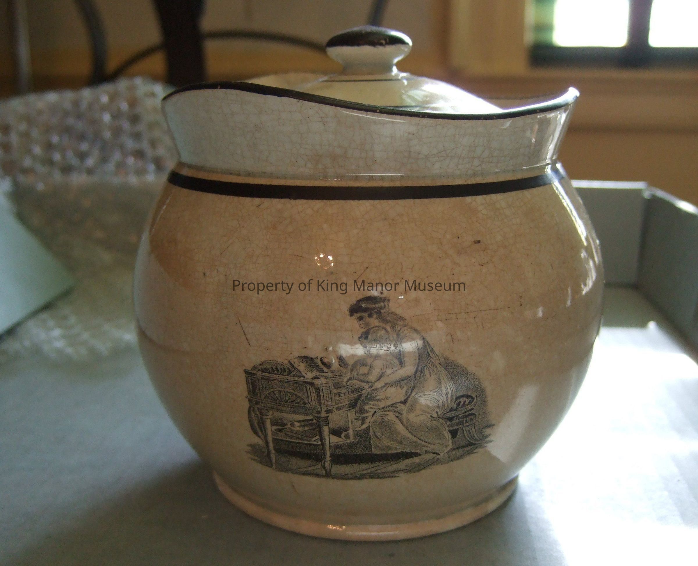 Lidded ceramic jar. White earthenware with hand painted black lines on upper portion and lid. On either side of jar, two transfer print scenes of woman and child. On one side, woman dressed in Grecian style is seated on Klismos style chair, holding basket of flowers in one hand and playing with the child, who stands on the floor. On the other, the woman and child are seated at a piano, as if the woman was giving a lesson to the child.