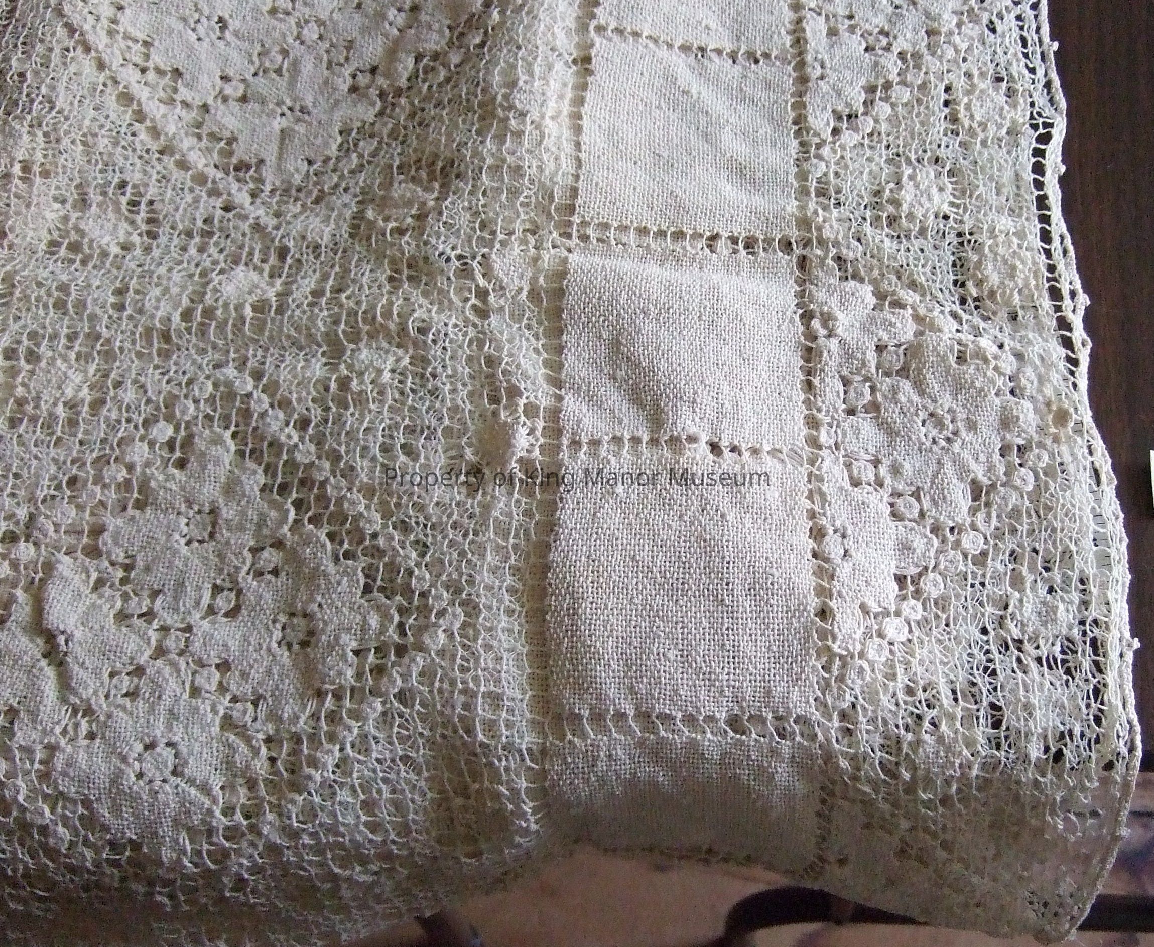 Hand crocheted tablecloth, cotton, with rectilinear patterns.
