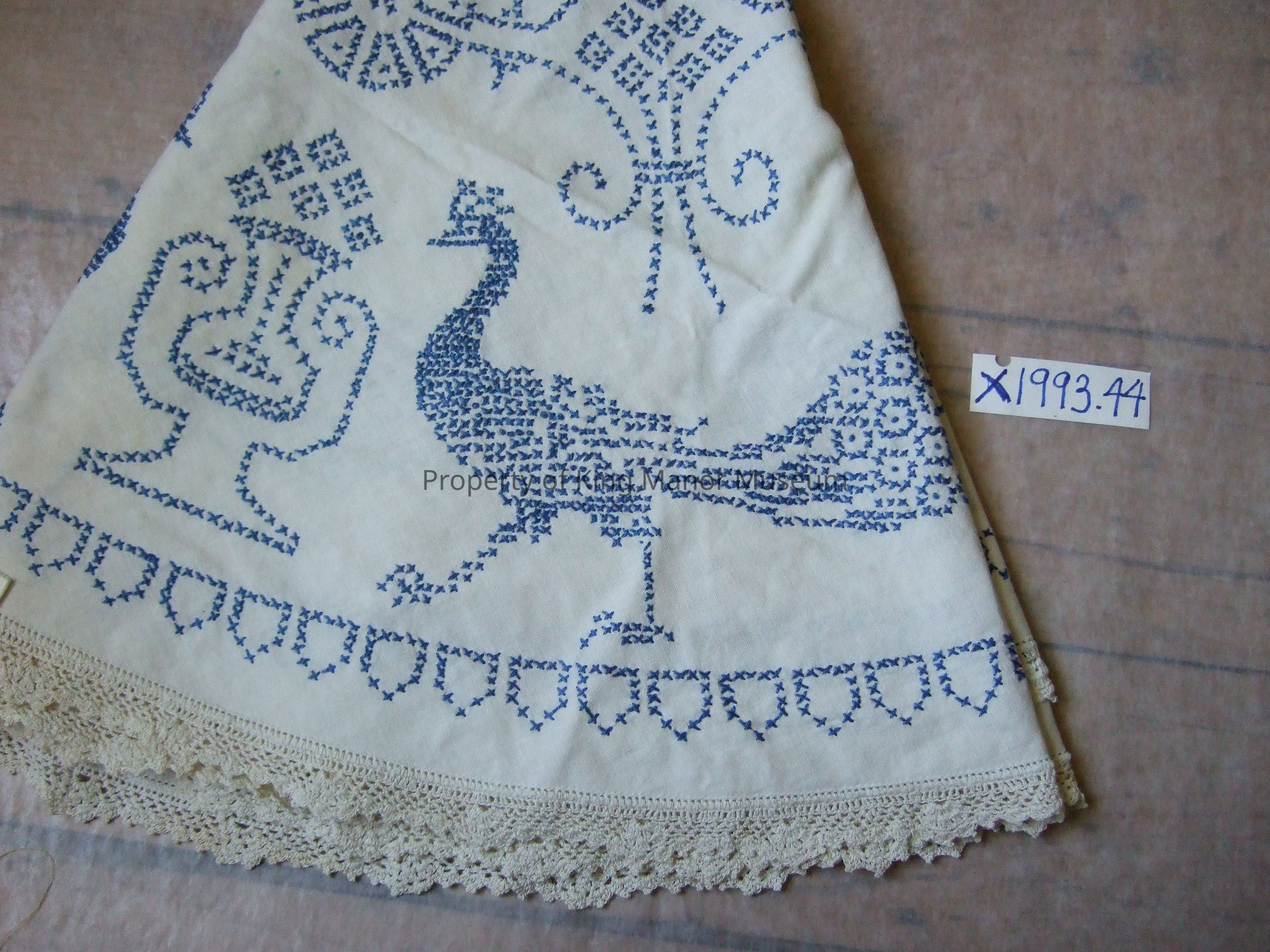 Round, handmade white cotton cloth with peacocks an durns in blue cross-stitch. White cotton handmade border.