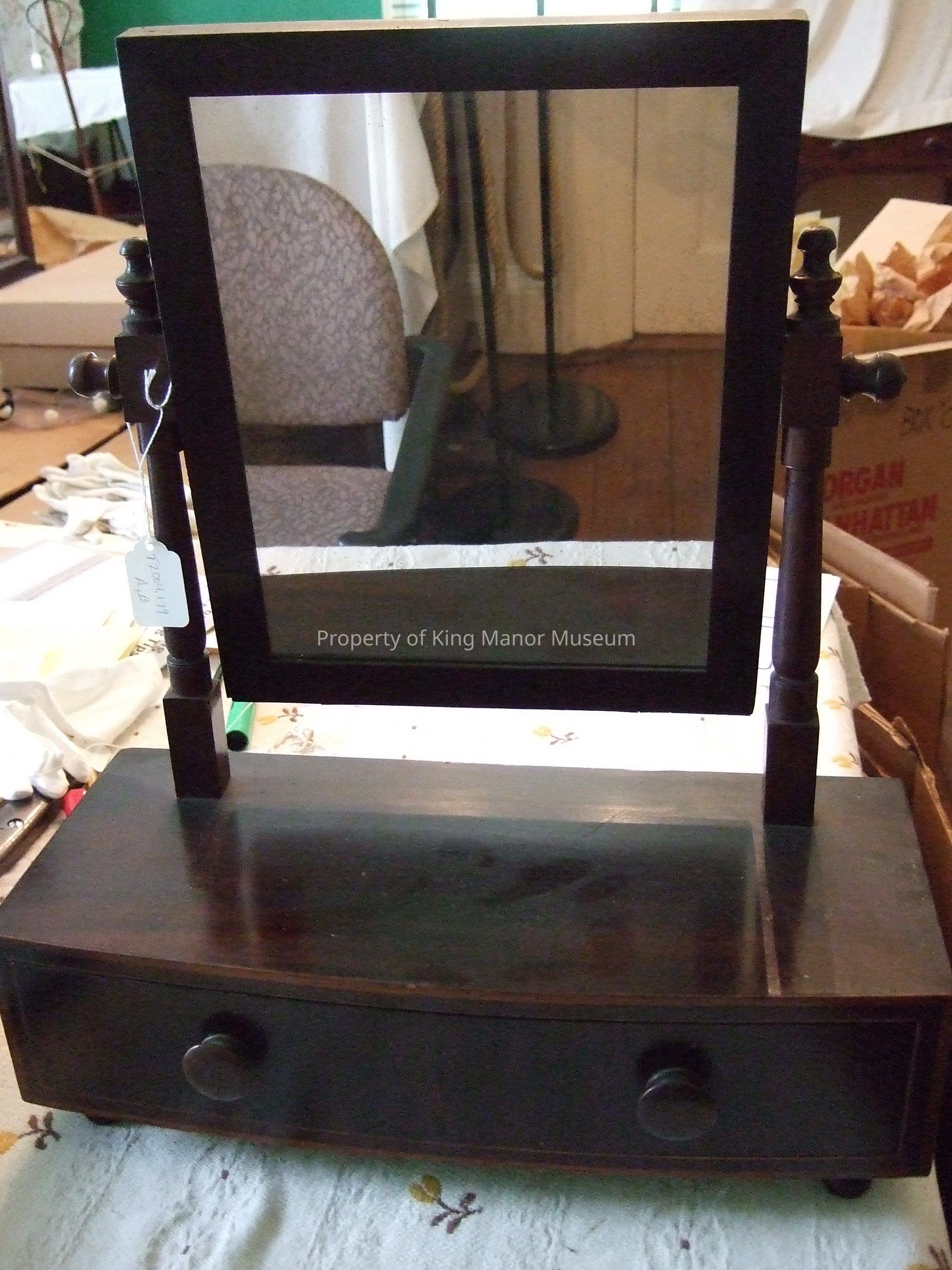 Wood (mahogany) bow front dresser mirror with one drawer, 2 round wooden pulls, set on 4 bun feet. Mirror supported with slender baluster posts on rectangular newels. Found in drawer loose nails and blank KMA Tag.