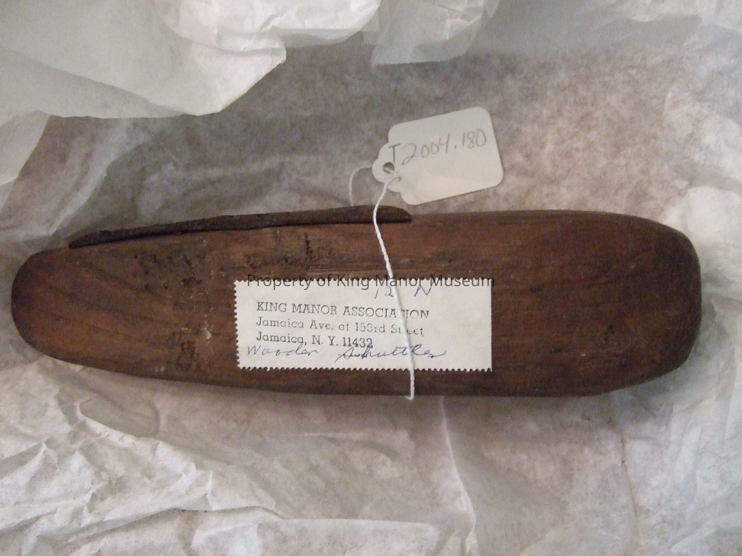 Arrow shaped wood shuttle or fragment, with scrap of leather attached. Small hole in wood.