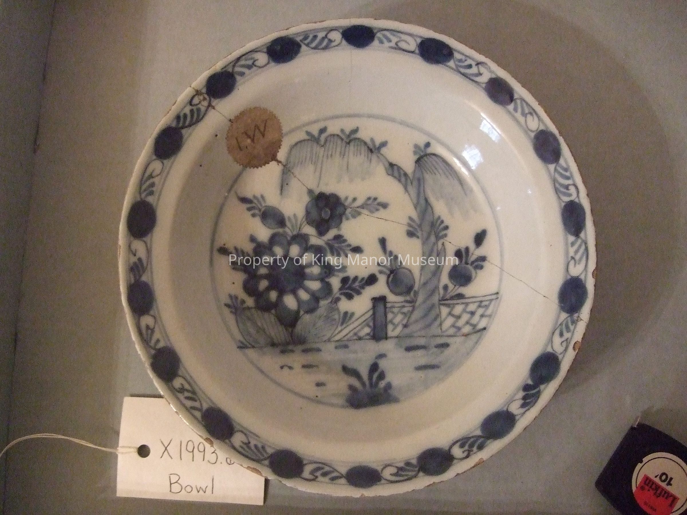 Porcelain Chinese underglaze blue bowl with stylized floral motif in bowl consisting of a tree, fence, and assorted flowers, and a thumbprint and feather border on rim. Mark on verso in blue resembles an F or combination of T and F.