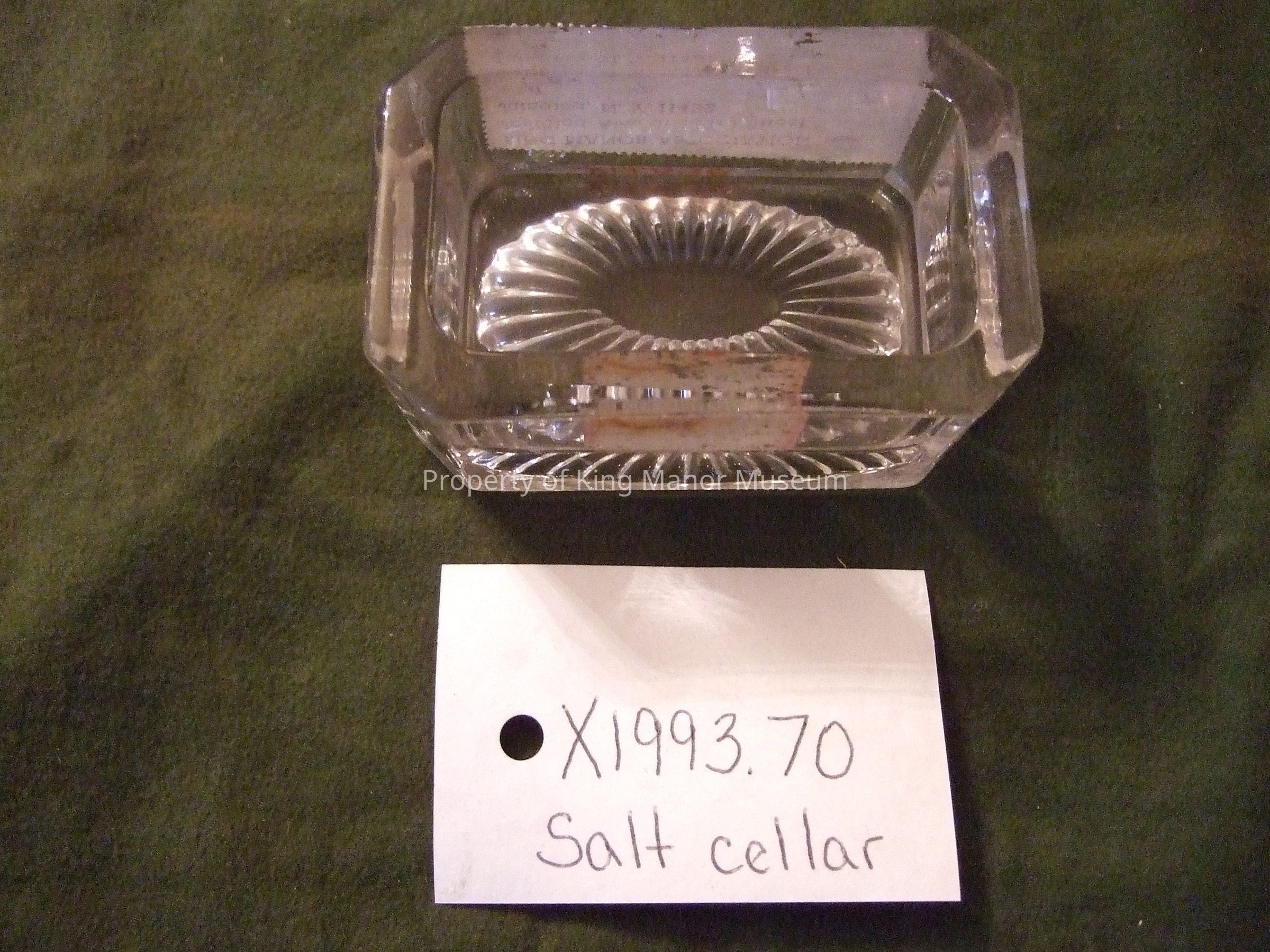 Clear glass rectangular salt cellar with canted corners. Incised oval sunburst on bottom.