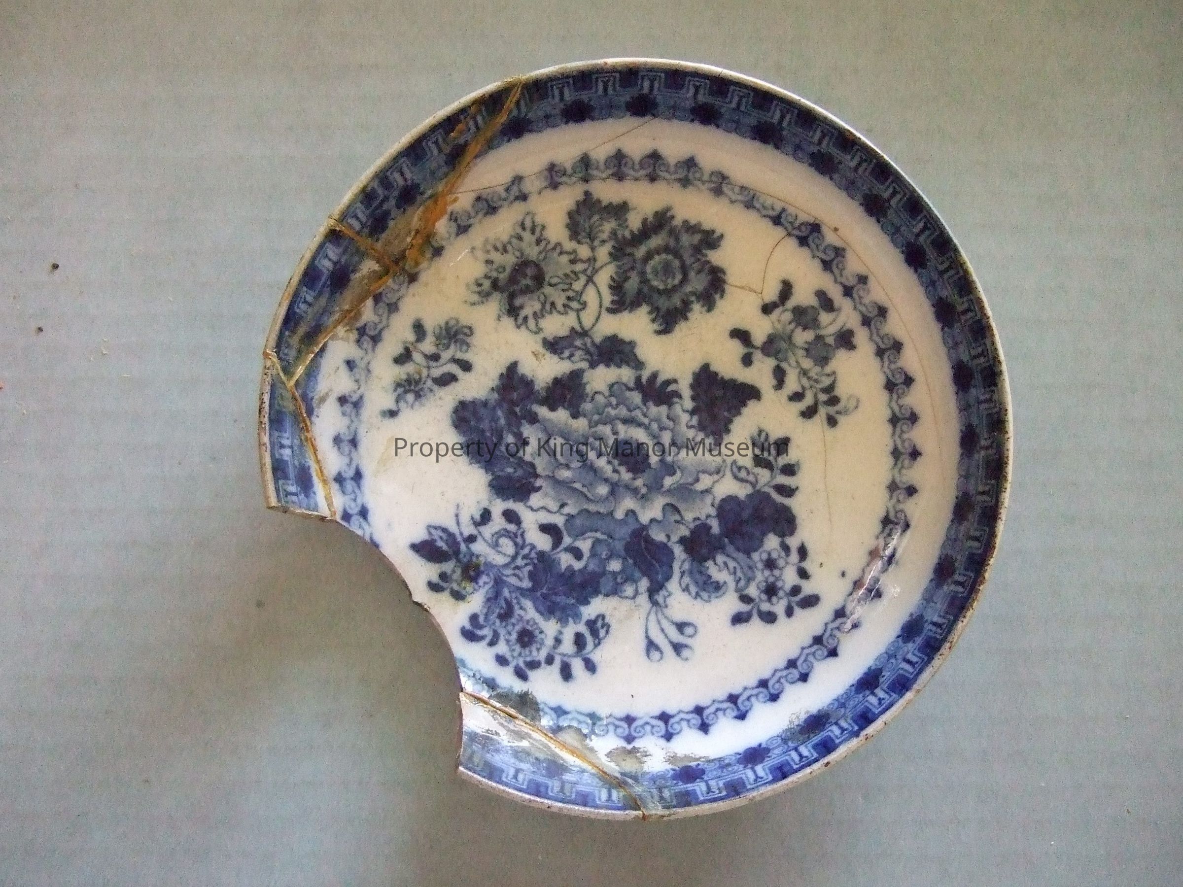 Hand cut label on underside written in pen, 1874 and indication that the "sauser is 400 years old"; the remaning handwriting is hidden beneath a Jamaica Assoc. label.Collection