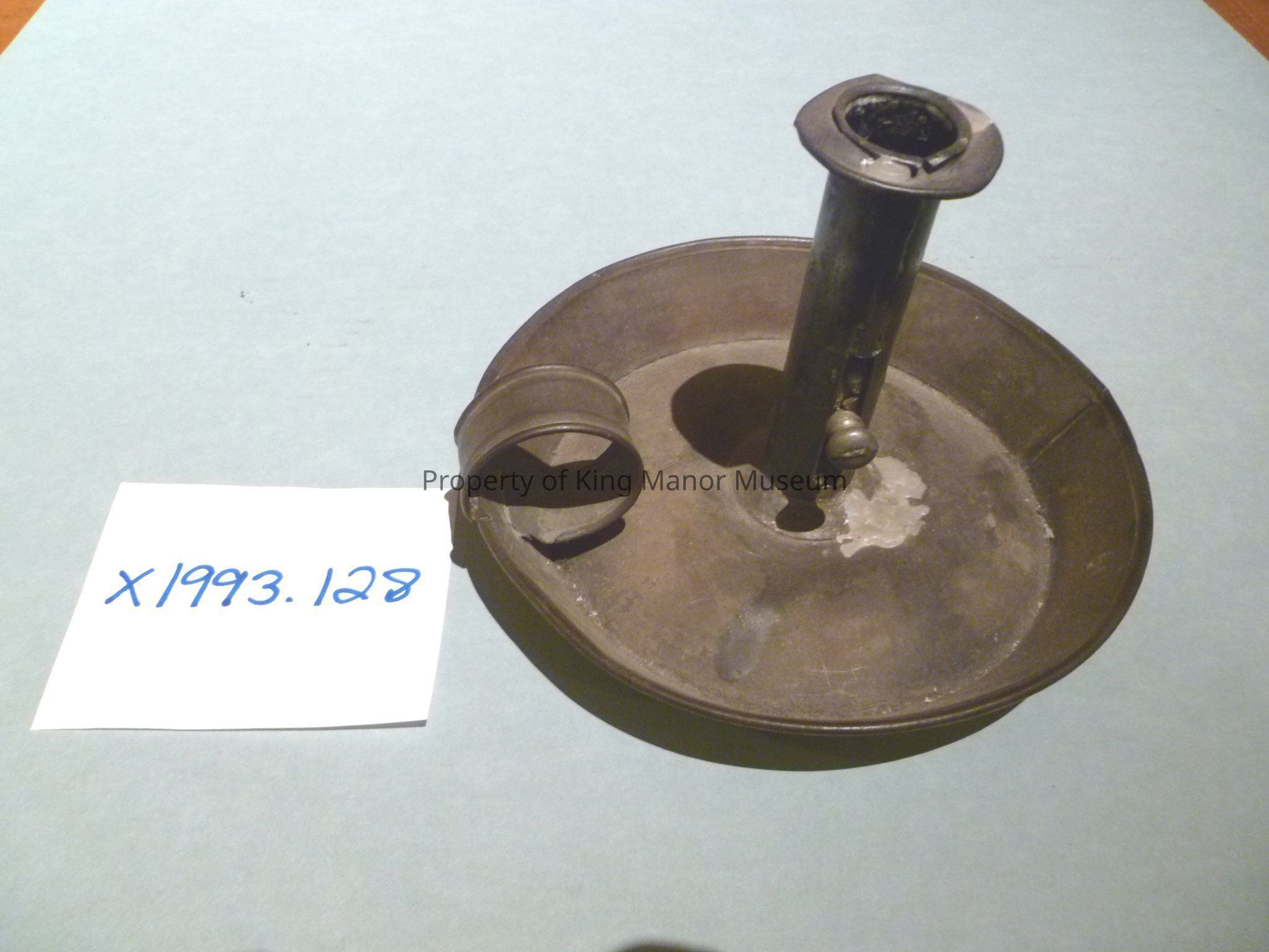 Tin candlestick with loop for forefinger, knob to adjust candle height and wide shallow dish for catching the wax. No maker's marks. KMA sticker "7-C"Collection