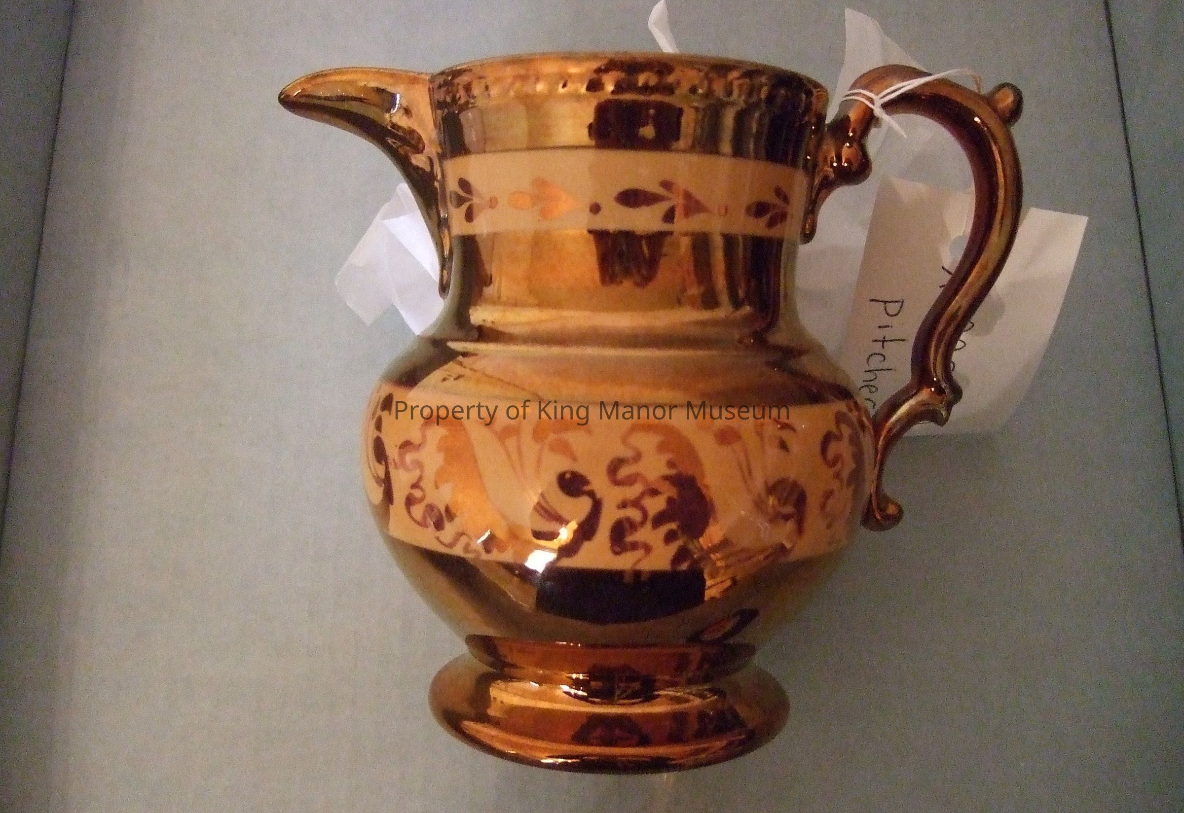Copper luster pitcher with 2 decorative yellow painted bands with floral motif. Spout has molded acanthus leaf decoration. Molded handle and molded beading around rim. KMA sticker "7-I-C"Collection