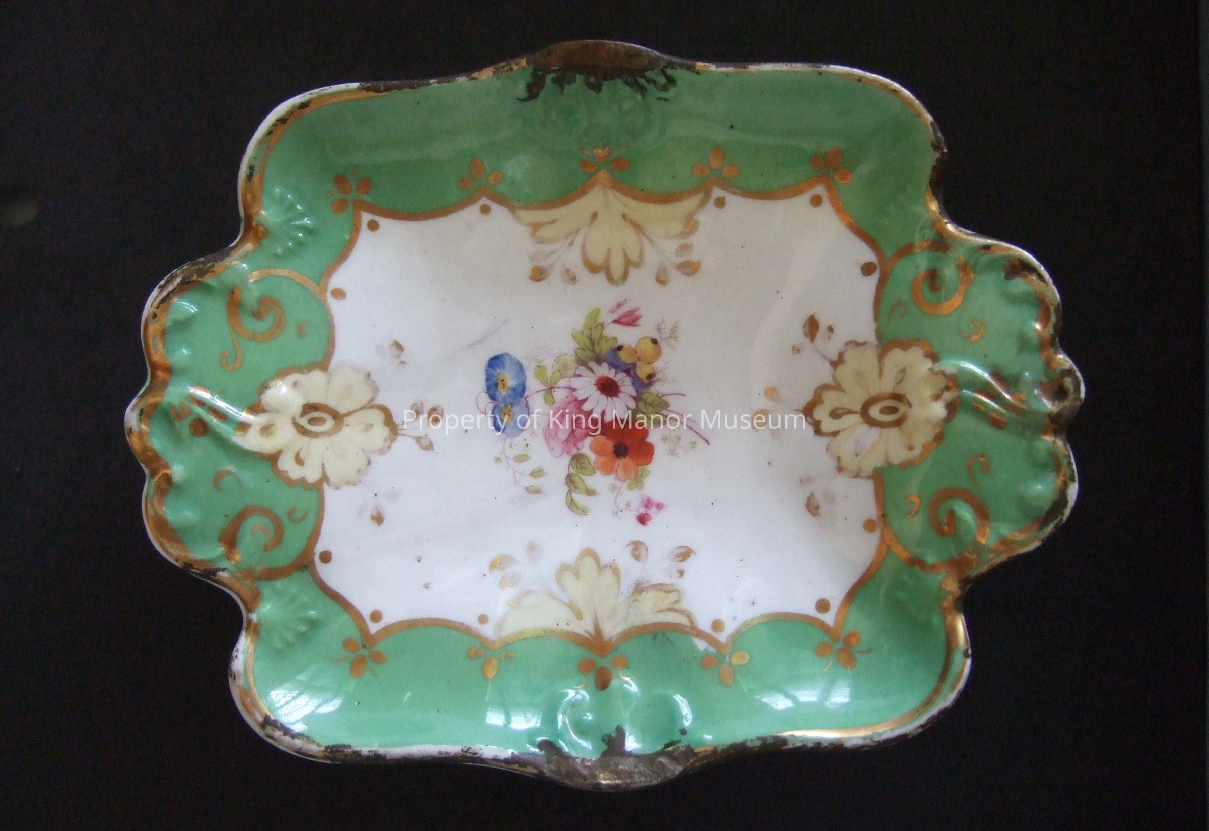 Porcelain footed dish, rectangular with lambrequin shaped handles. Border painted dark apple green with gilt outline. Handpainted floral design in center of white porcelain ground. Probably English. Marked in pencil on bottom "Leeds/1.00/.50"Collection