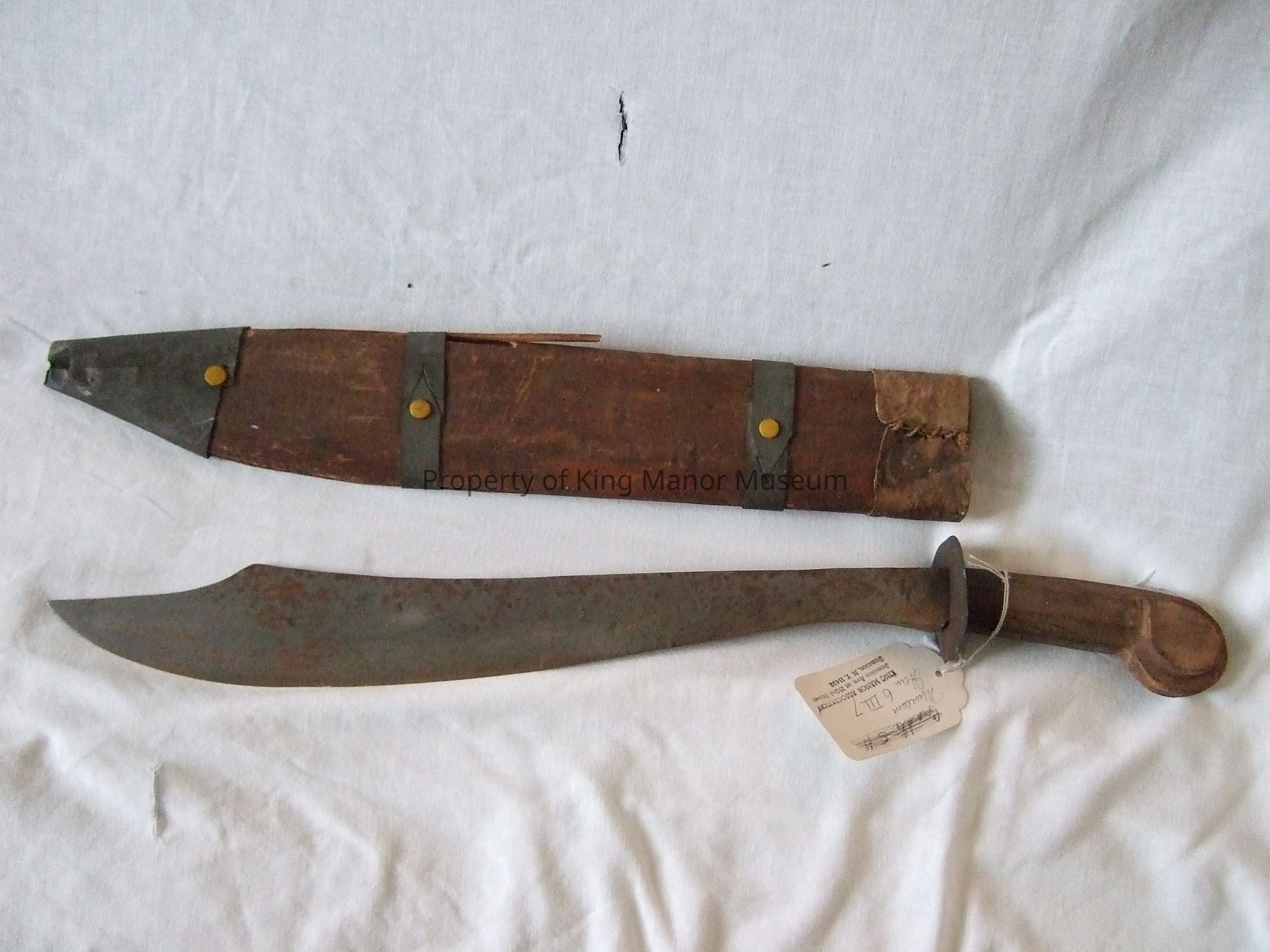 Steel machete having carved wood handle and sheath; belonged to Capt. George Tilly, a Jamaica resident who was killed in the Phillipines