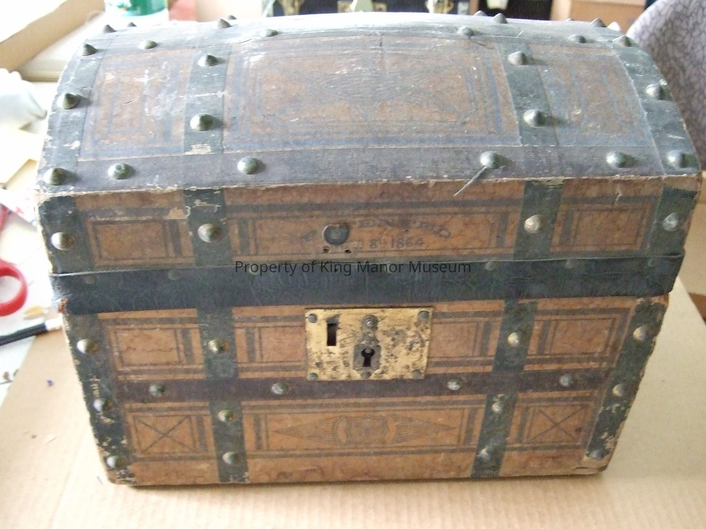 Child's paper covered wood steamer trunk having metal straps and bosses; fitted with several interior compartments