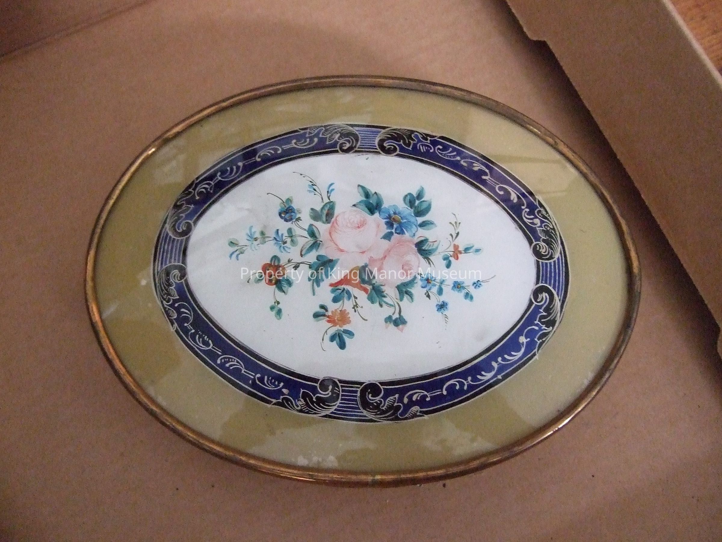 Oval-shaped cardboard box having reverse painted glass inset on lid