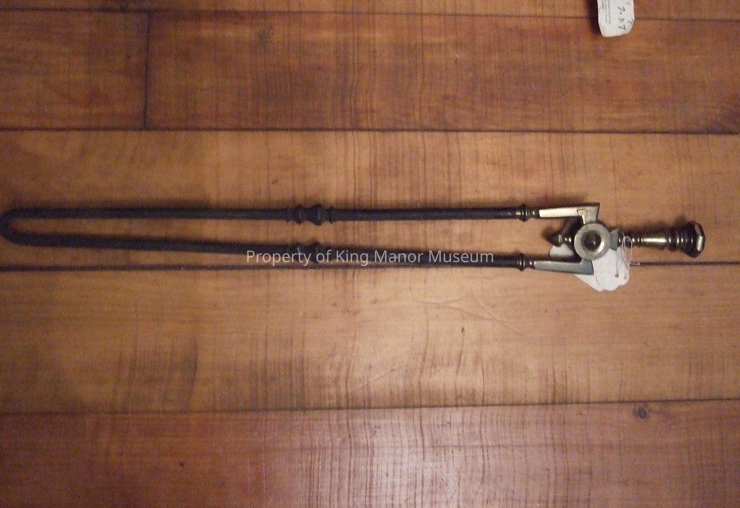 Fireplace tongs having forged iron flattened end pincers supported on brass handle having squared shoulders and faceted finial