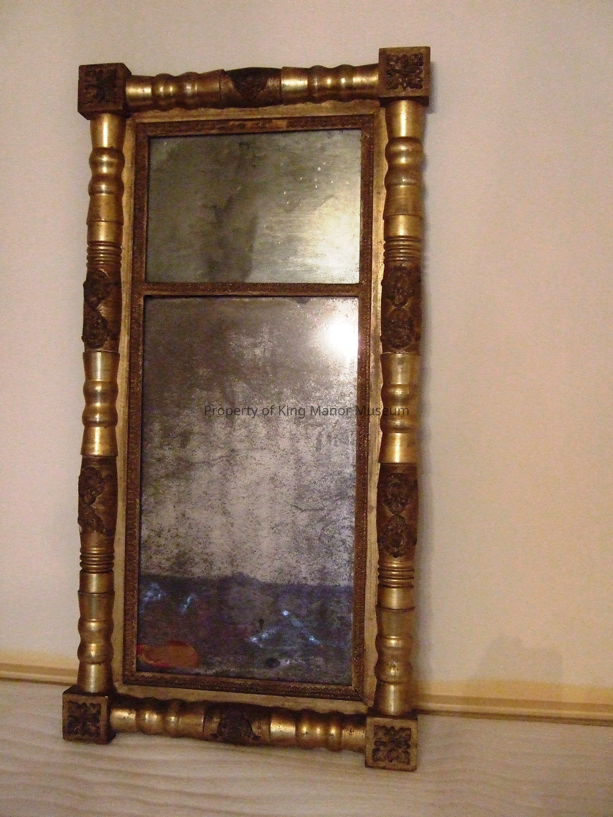 Silvered glass two-part mirror framed with gold painted wood frame having gilt gesso applied decorations