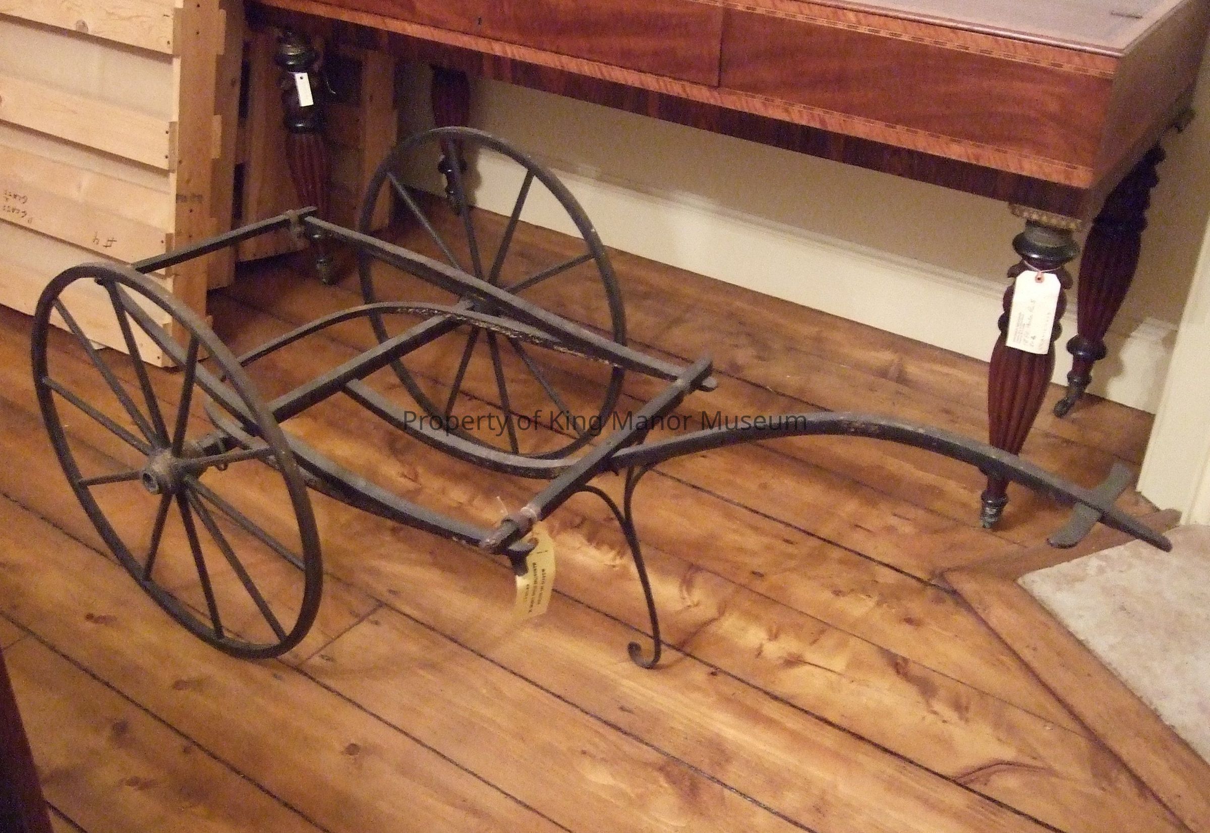 Black painted wood cart having remnants of gold painted detailing and leather fittingsCollection
