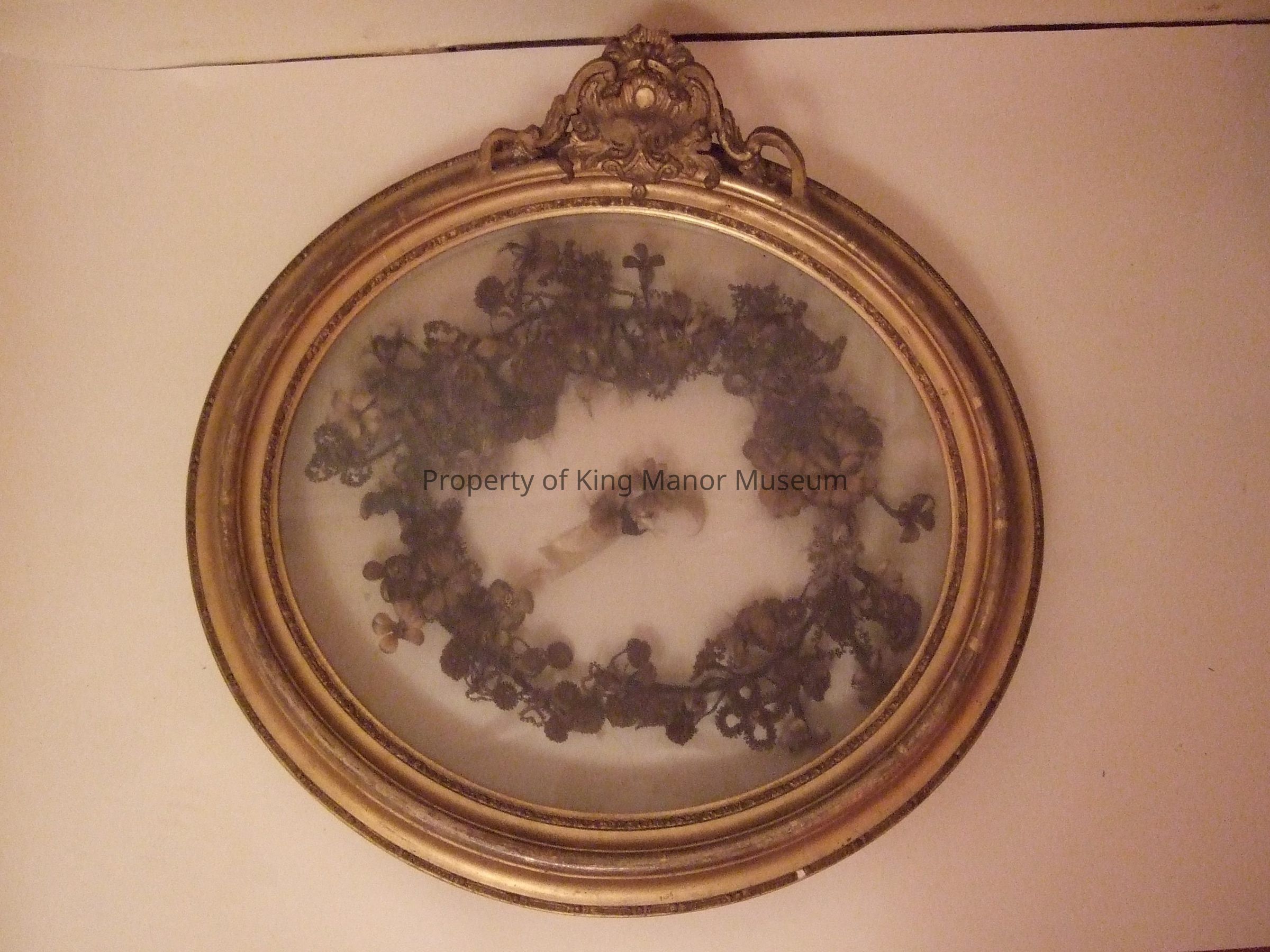 Mounted two-dimensional floral arrangment behind glass in oval gilt wood frame topped with scrolled decoration; the flowers are fashioned of hair and other materialsCollection