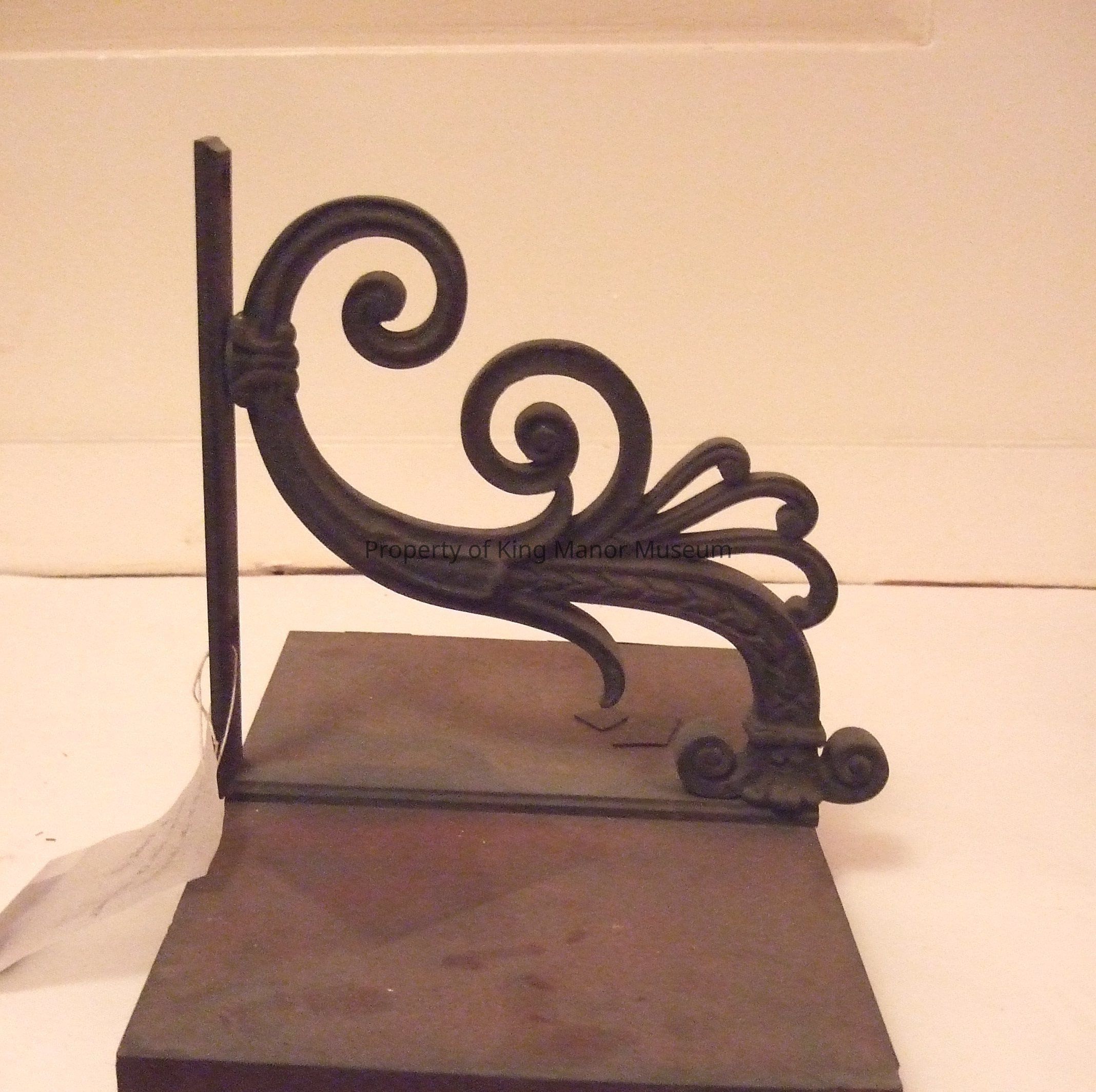 Cast iron scrolled bracket fastened to varnished wood shelf