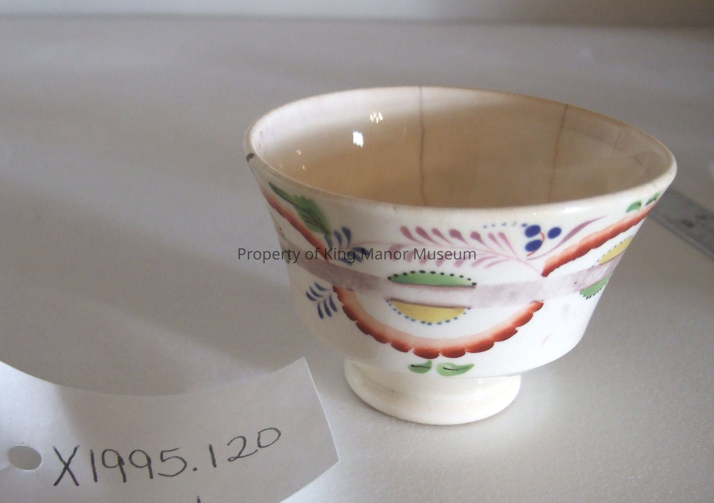 White earthenware footed teacup having polychrome painted and lustre decoration on outer body
