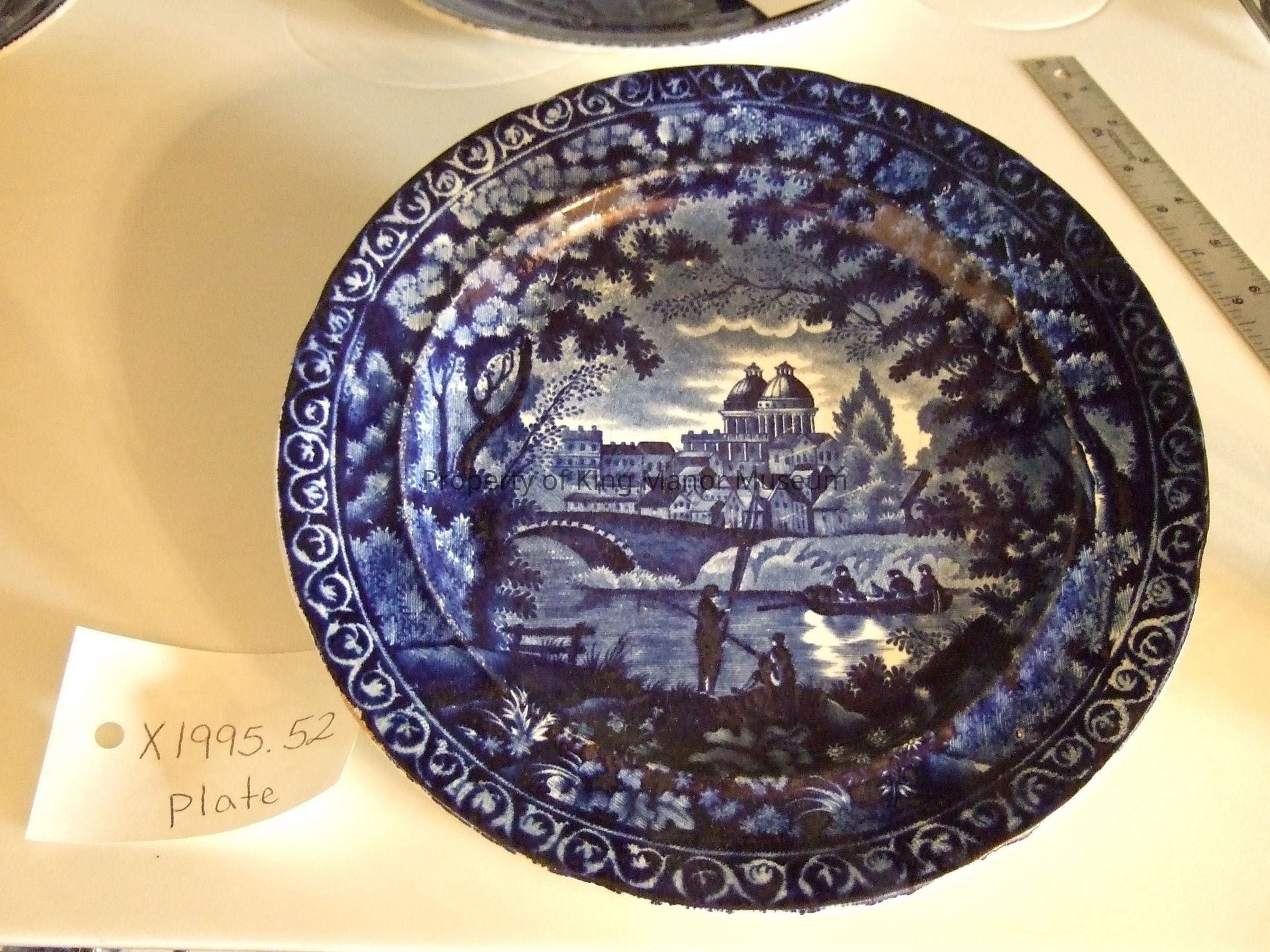 Earthenware plate having blue and white transfer pattern featuring a moonlit bridge and river scene with a domed buildings in the background and figures in foreground ; StaffordshireCollection