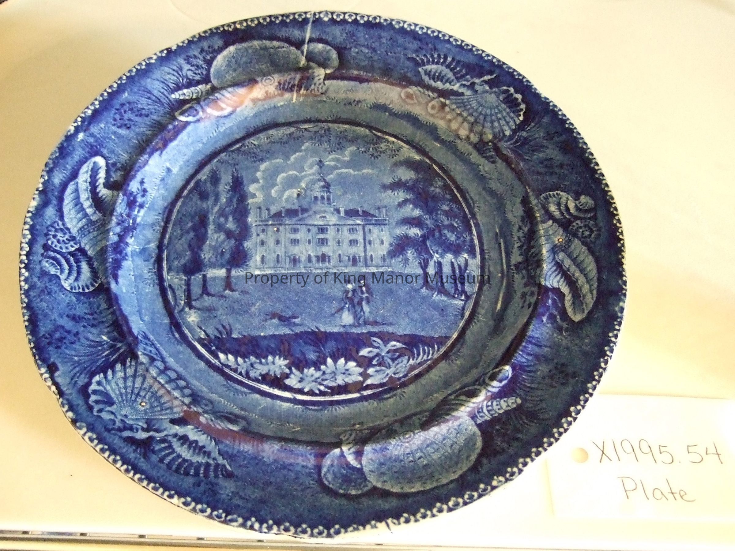 Ceramic plate having blue transfer decoration featuring a manor house having dome and figures walking in the foreground; Transylvania University KYCollection