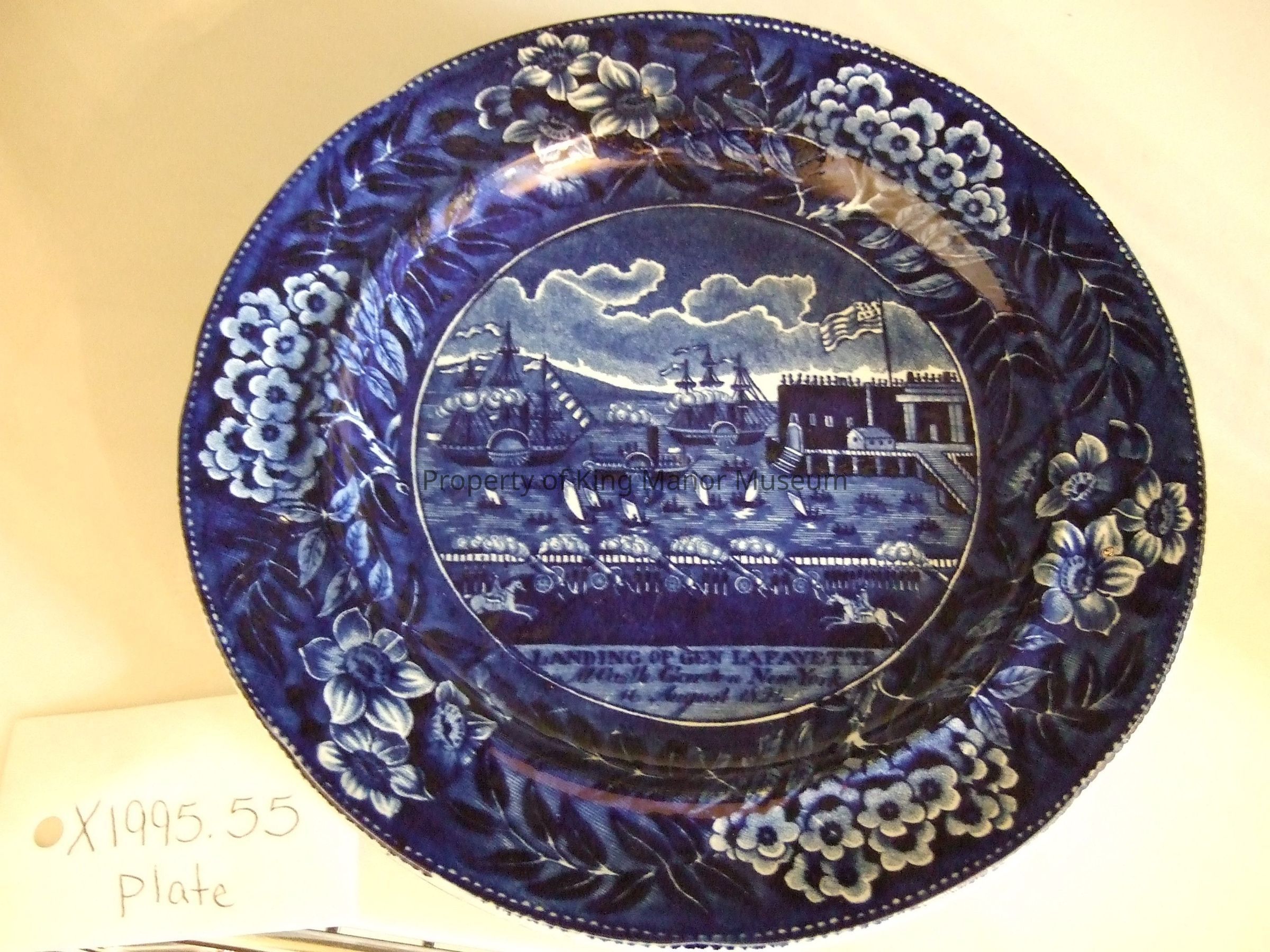 Earthenware plate having blue transfer decoration featuring a ship and fort scene; Staffordshire stamp