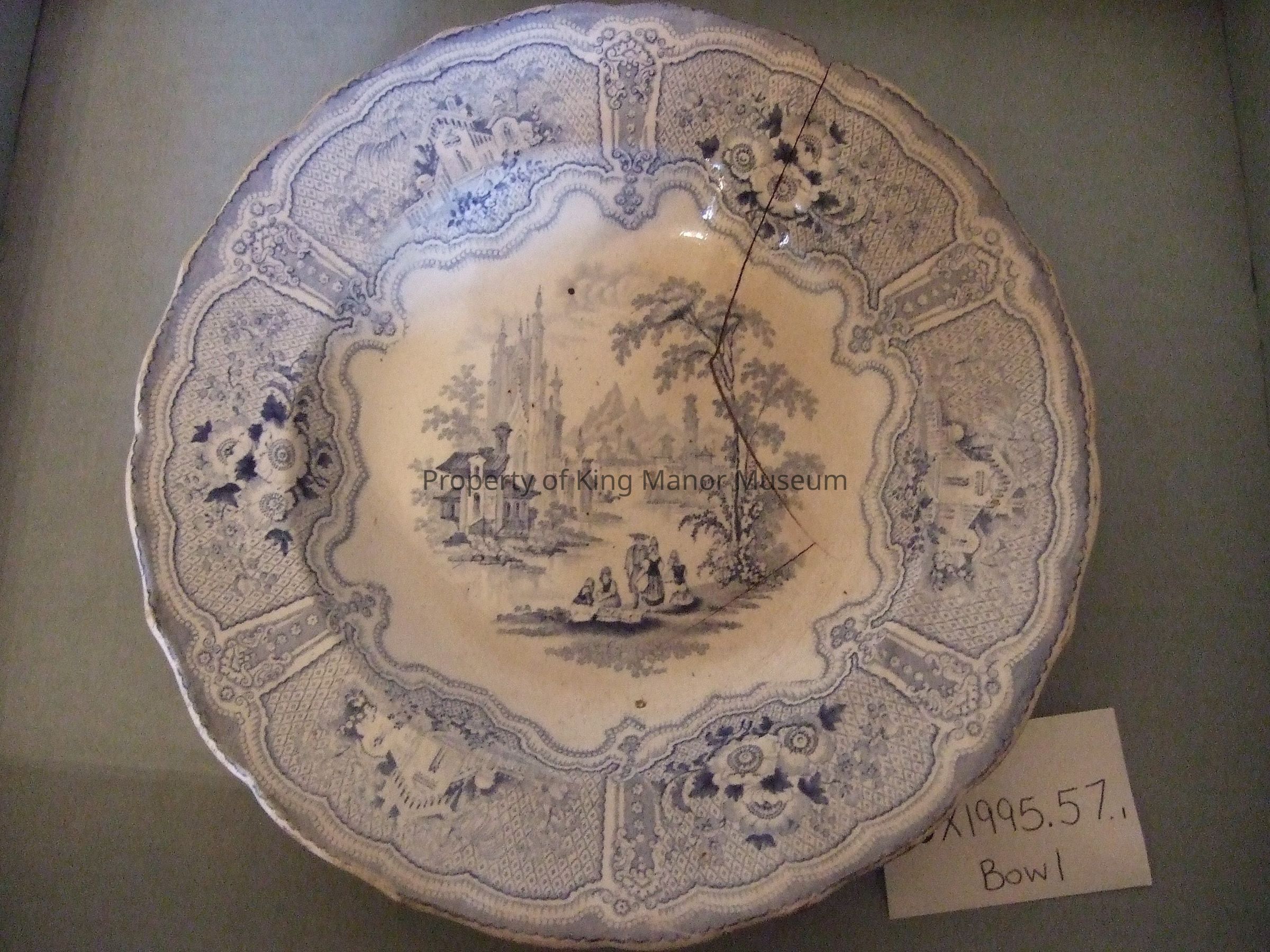 One of three earthenware bowls having transfer print decoration featuring a castle and river scene with figures; maker, SyriaCollection