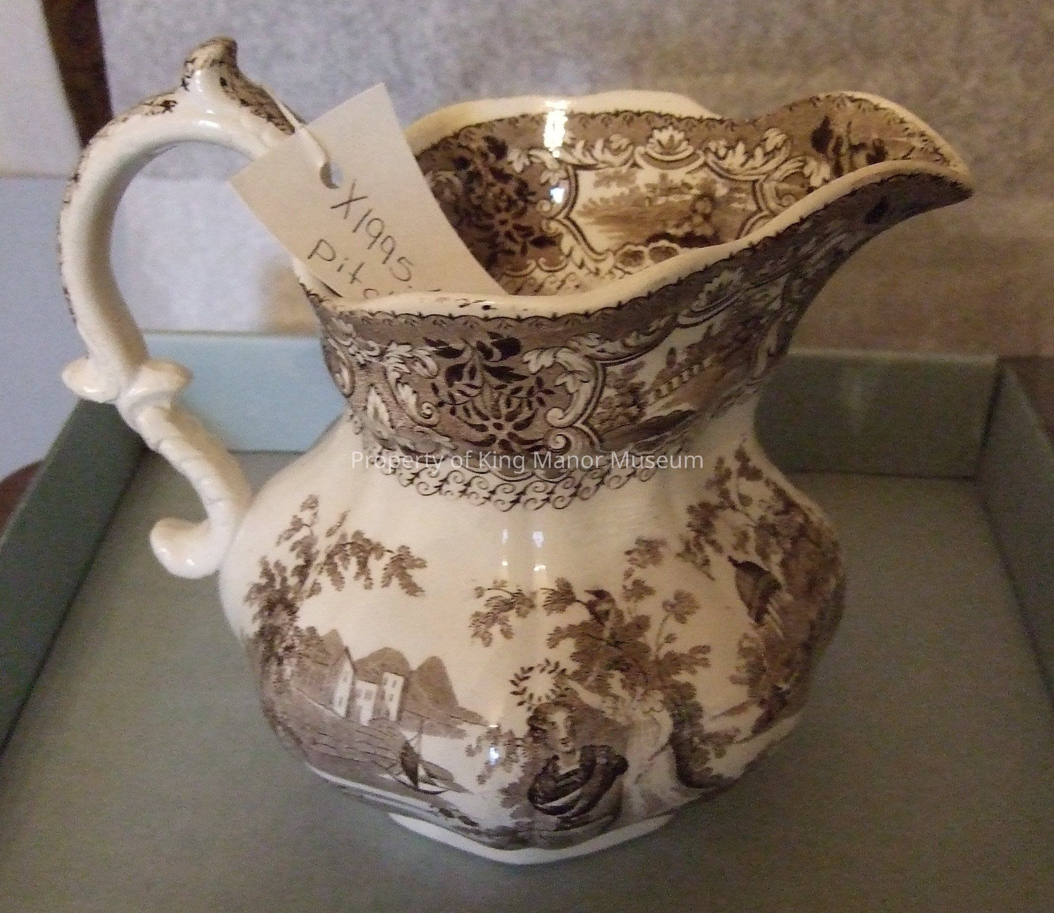 Earthenware pitcher having brown transfer pattern featuring classical vignettes alternating with waterway and boat scenes; makers mark, 16Collection