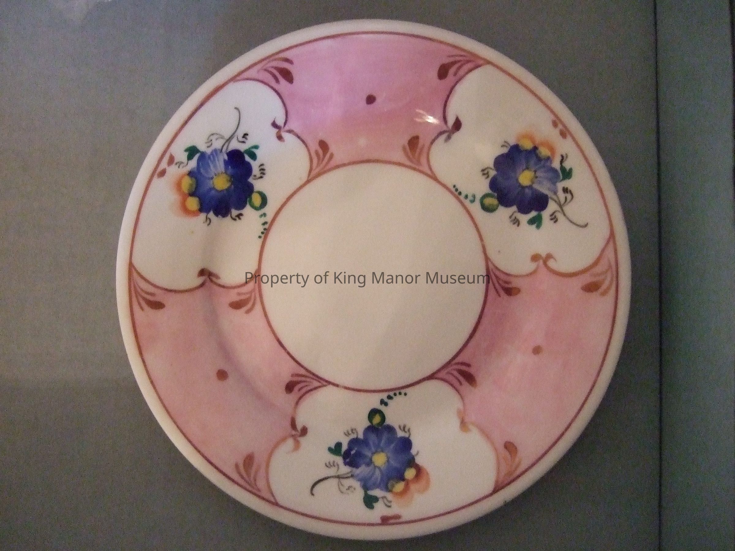 One of 6 earthenware plates having blue cornflower sprigs in white reserves of pink border