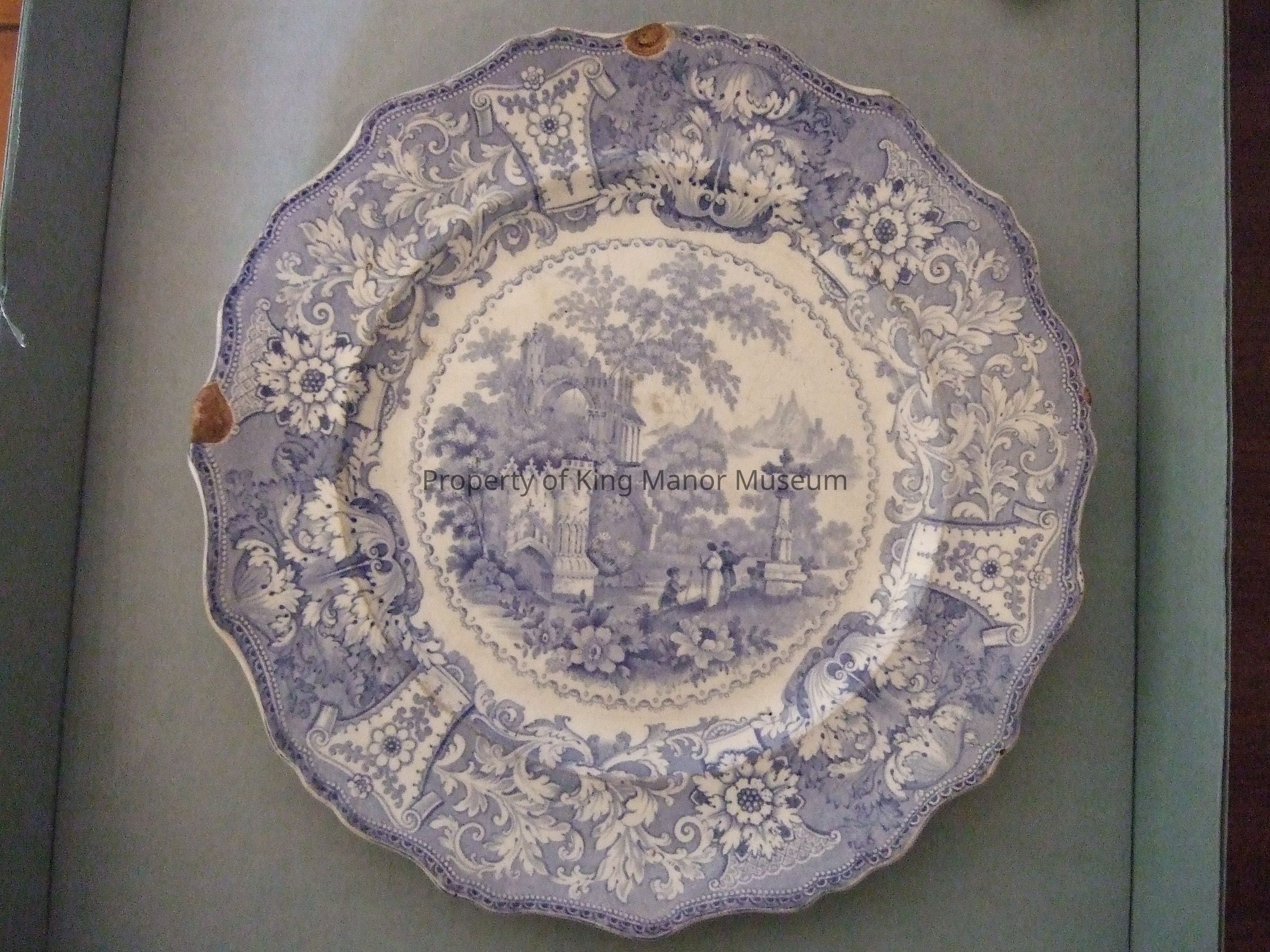 Blue and white ceramic transferware plate having castle with river scene and monument with cross