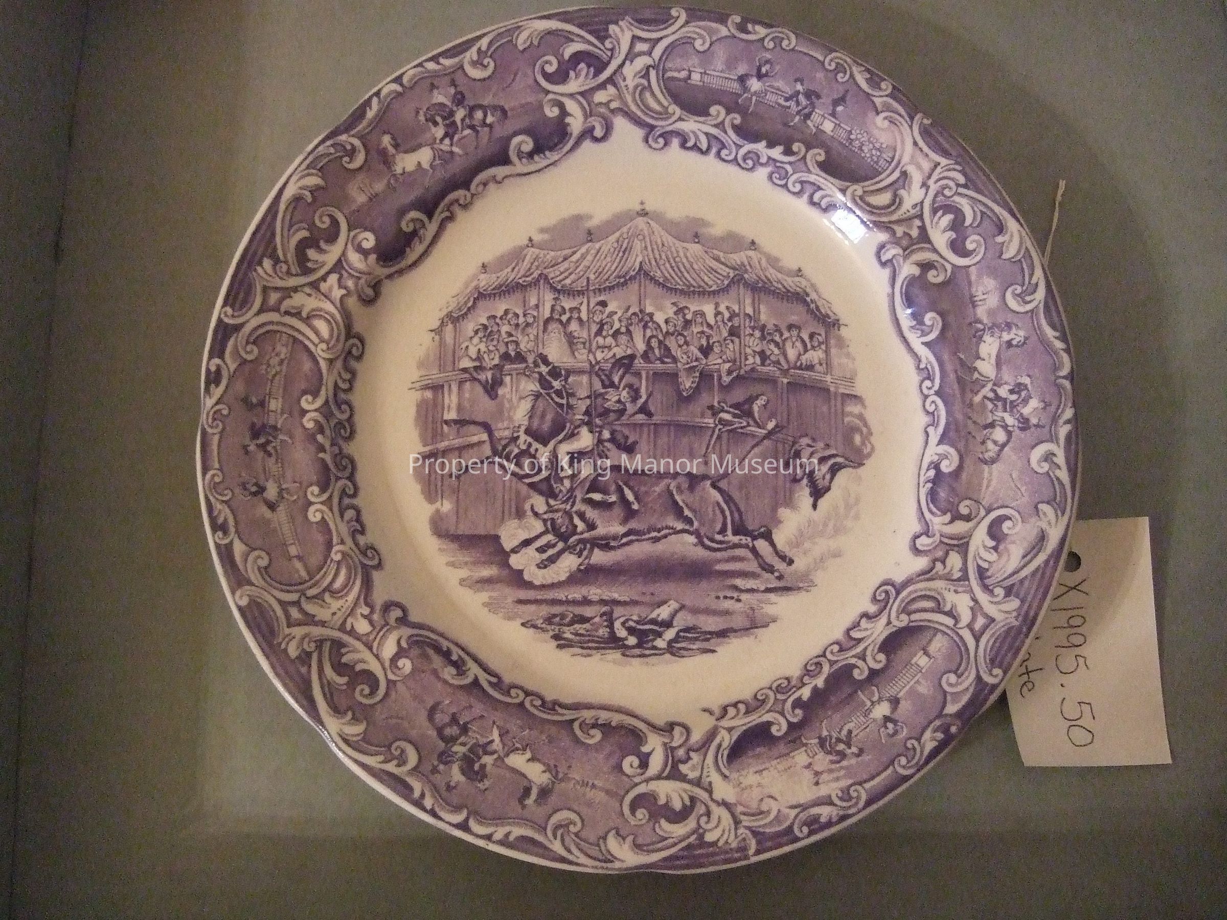 Purple and white transferware ceramic plate featuring a bullfight scene; the underglaze mark on reverse, COSTUMBRES ESPAGNOLES ENGLAND 1795