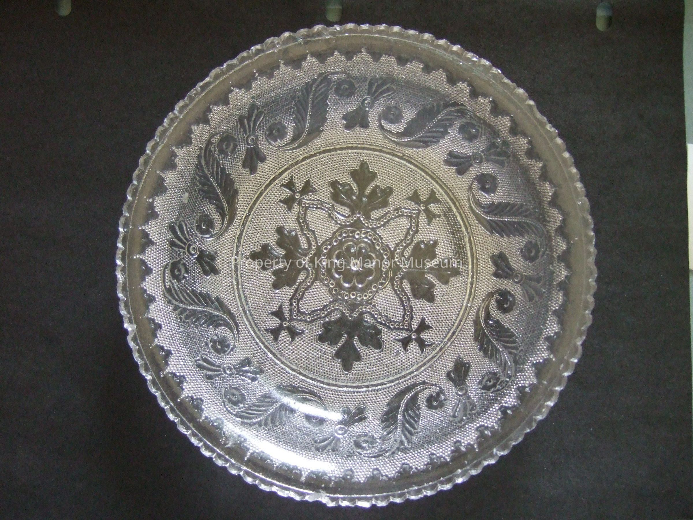 Pressed glass dish having foliate S-scroll design