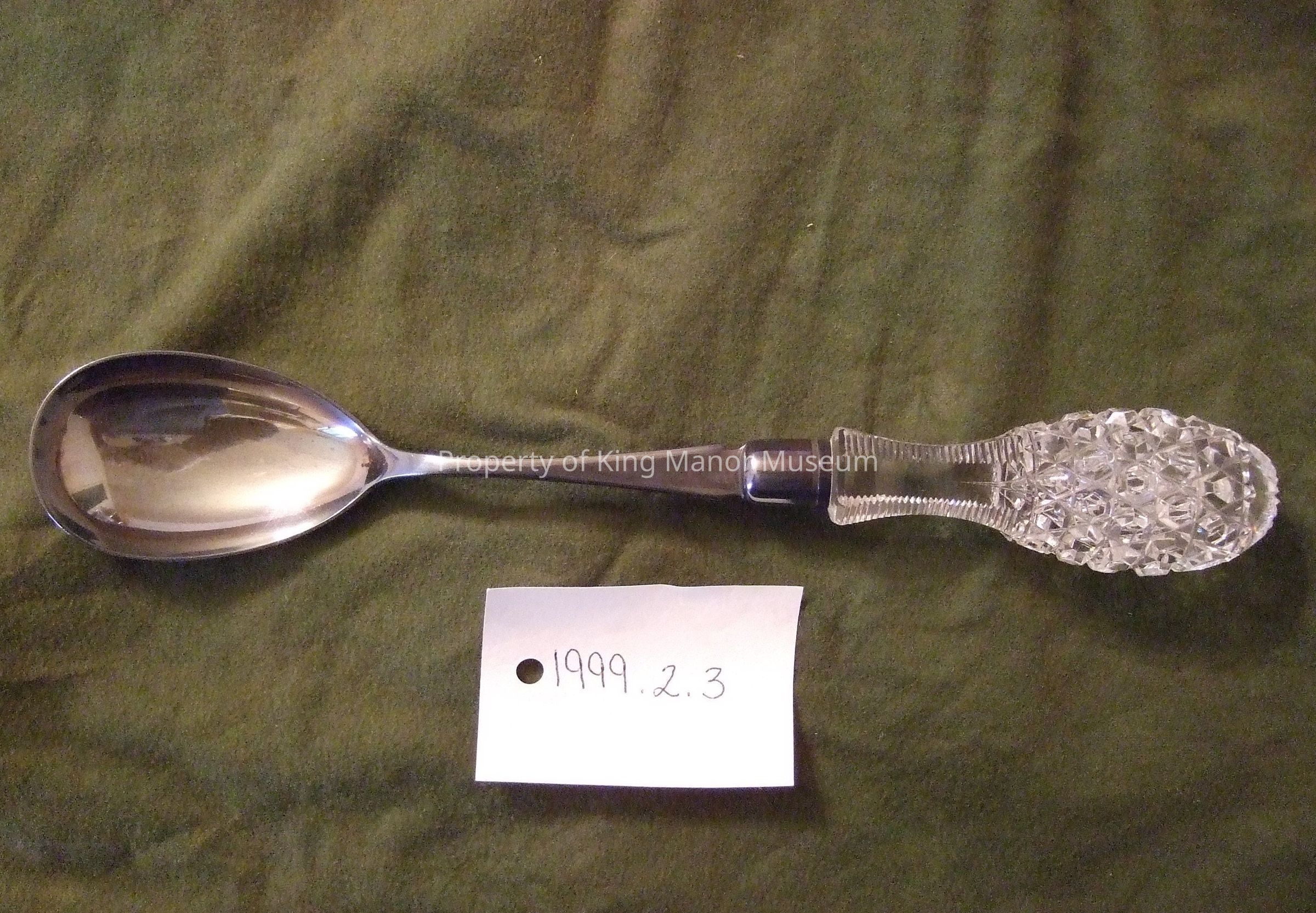 Silver plated serving spoon having diamond cut patterned crystal ovoid shaped grip